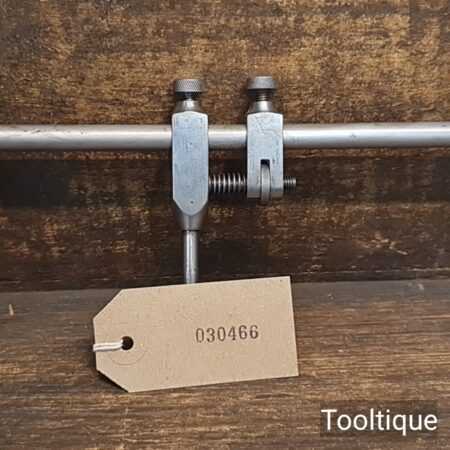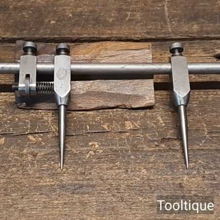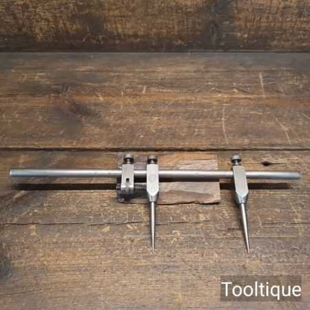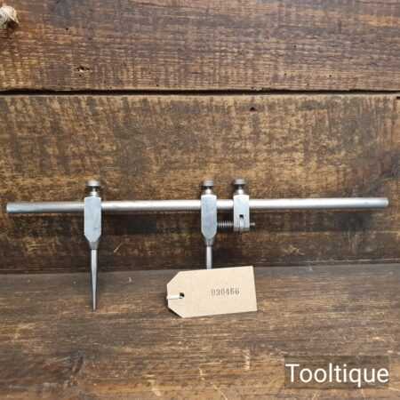 Vintage pair of fine adjustment 4” steel trammel points on a 12” steel grooved rod refurbished ready for use and in good used condition.