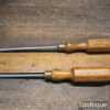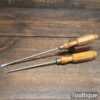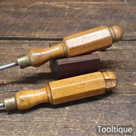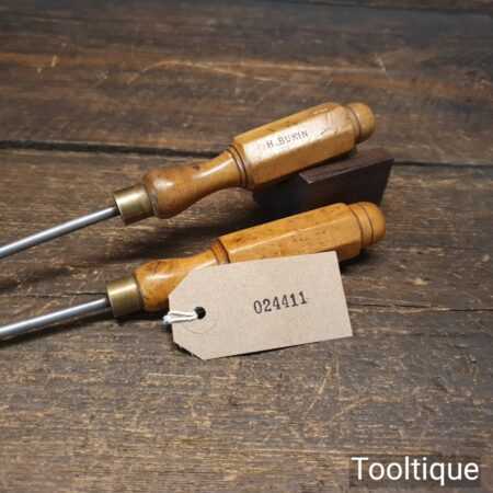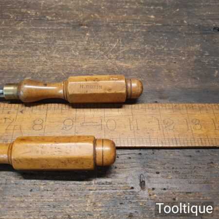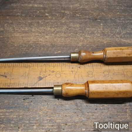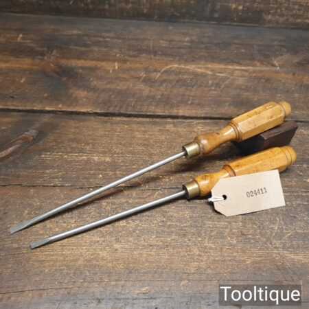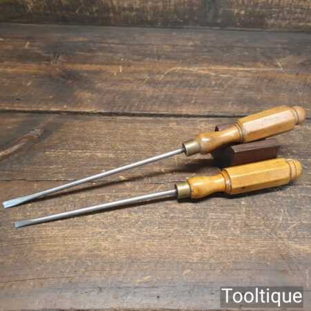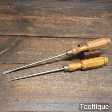Vintage pair of long reach slimline flat screwdriver with ¼” + 3/16” wide ends and boxwood London pattern handles. The screwdrivers have redressed heads using water cooled process and they are in good used condition. Note: small chip to the top of one handle (see images) and one by Hales Brothers.