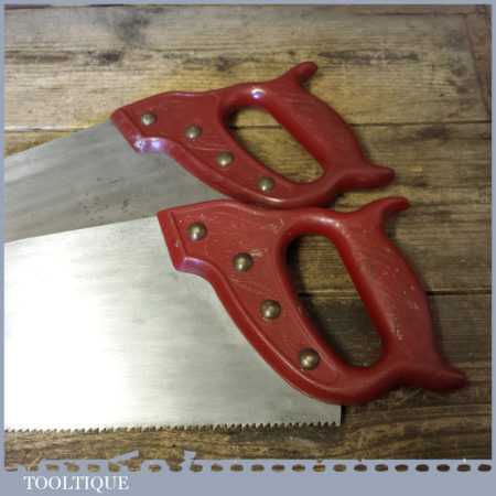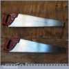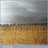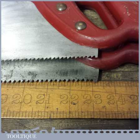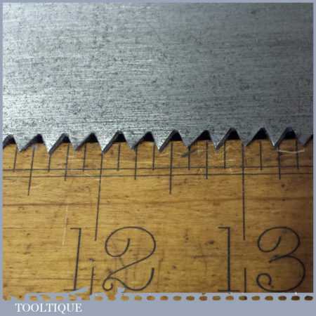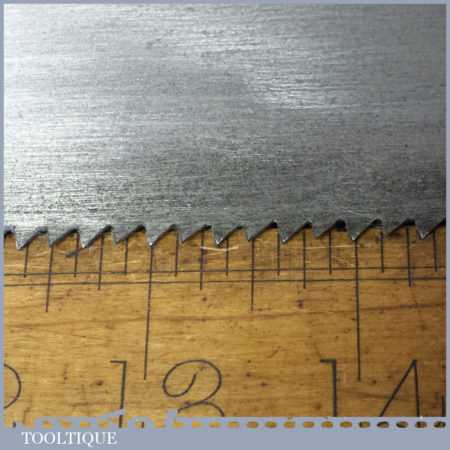 These saws have been thoroughly cleaned, jointed, resharpened and set by hand so that all the hard work of getting an old vintage saw right has been undertaken. We do this so that the next sharpening is easier and no more than a quick freshen up would be required. Those who are familiar with sharpening will know this is no small job and requires skill, effort and time to achieve good results.