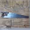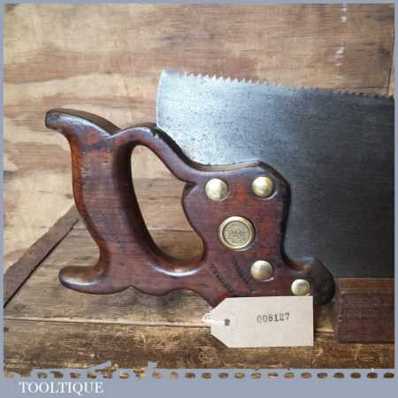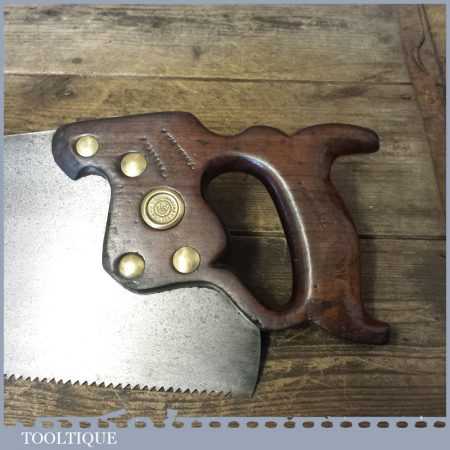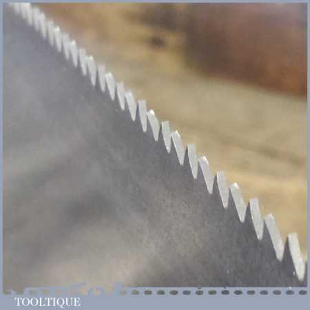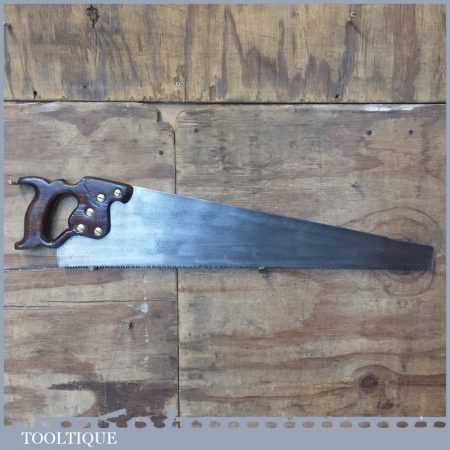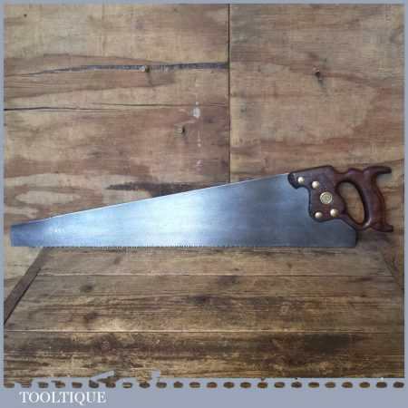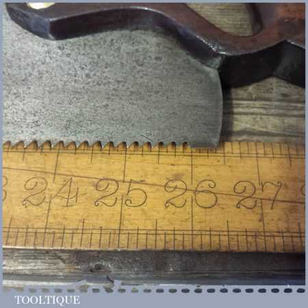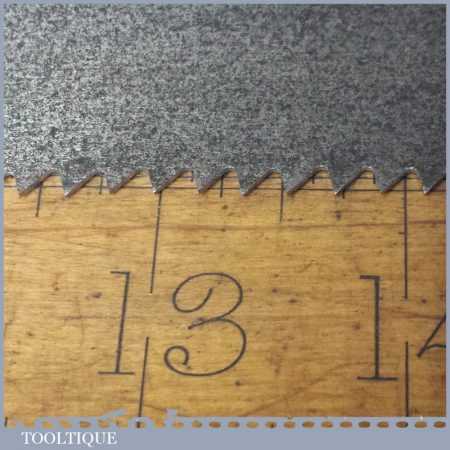 The saw has been thoroughly cleaned, jointed, resharpened and set by hand so that all the hard work of getting an old vintage saw right has been undertaken. We do this so that the next sharpening is easier and no more than a quick freshen up would be required. Those who are familiar with sharpening will know this is no small job and requires skill, effort and time to achieve good results.