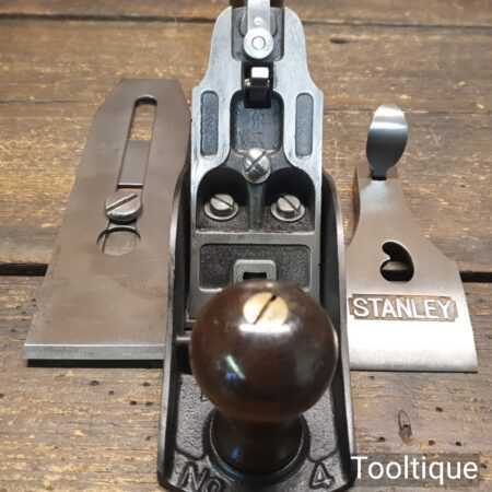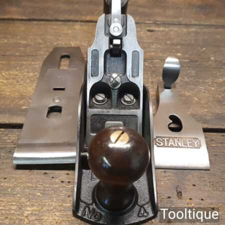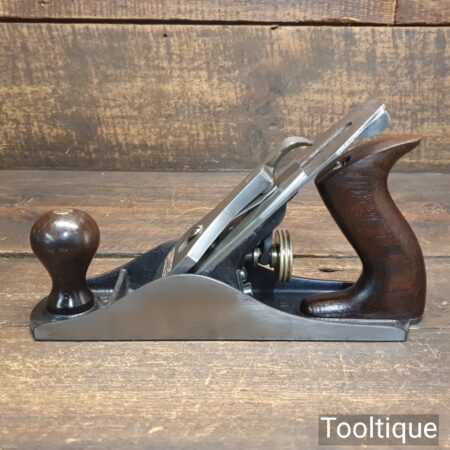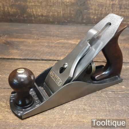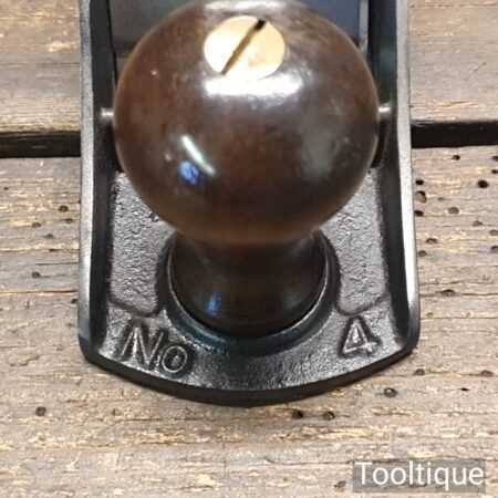 Vintage pre-war Stanley USA No: 4 smoothing plane with original iron and rosewood handles, fully refurbished and in good used condition, ready to use. When refurbishing planes, we do not merely clean them to make them look good, they are restored to a level that ensures they are actually ‘in plane to 0.025mm’ sharpened, fettled & honed and all the components are thoroughly cleaned so that they move freely. Our planes are specifically reconditioned to satisfy professional tradesmen who will instantly know the difference between buying one of our planes over general other used ones.