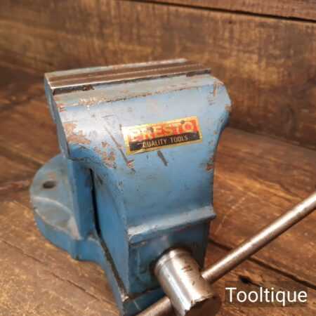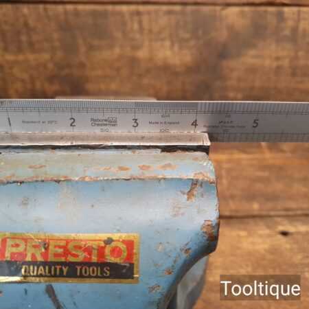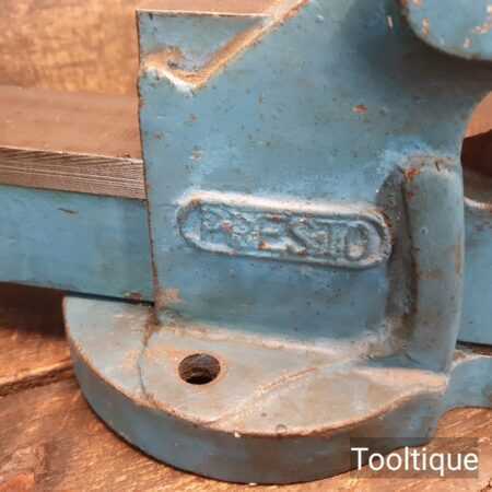 Vintage Presto England No: 1001 Engineers Vice with 4 ¼” Jaws refurbished for use and in good original condition. This has been completely stripped apart, degreased, cleaned and re-greased before reassembly. These are a very good quality vice and as you can see by its original label it hasn’t had a hard life.