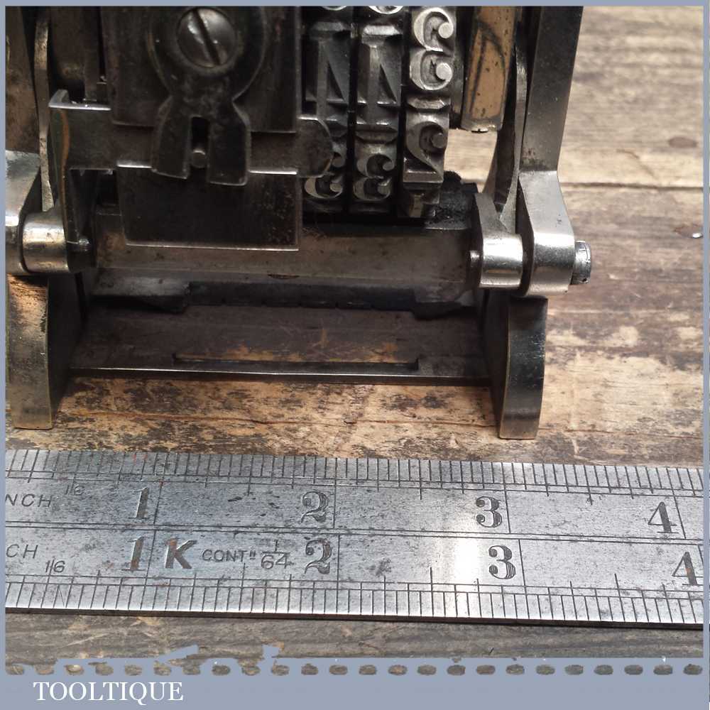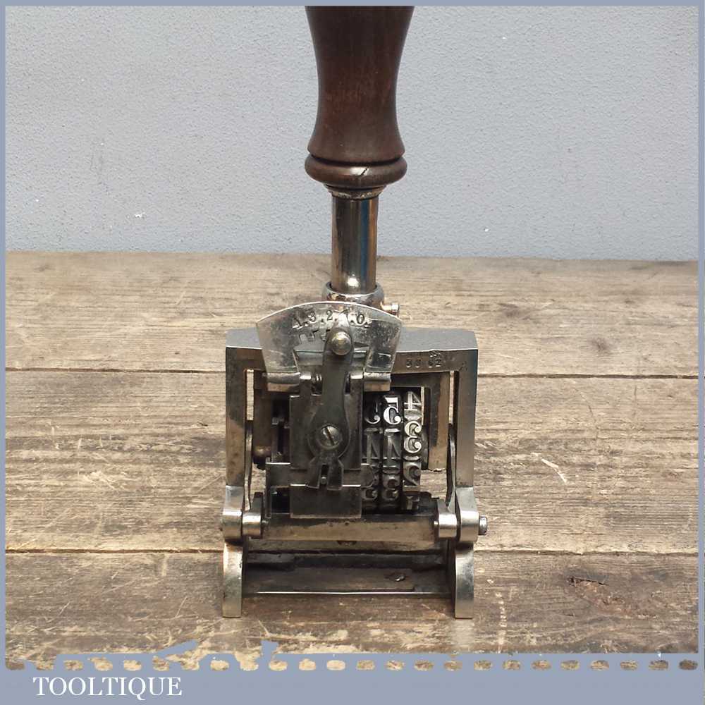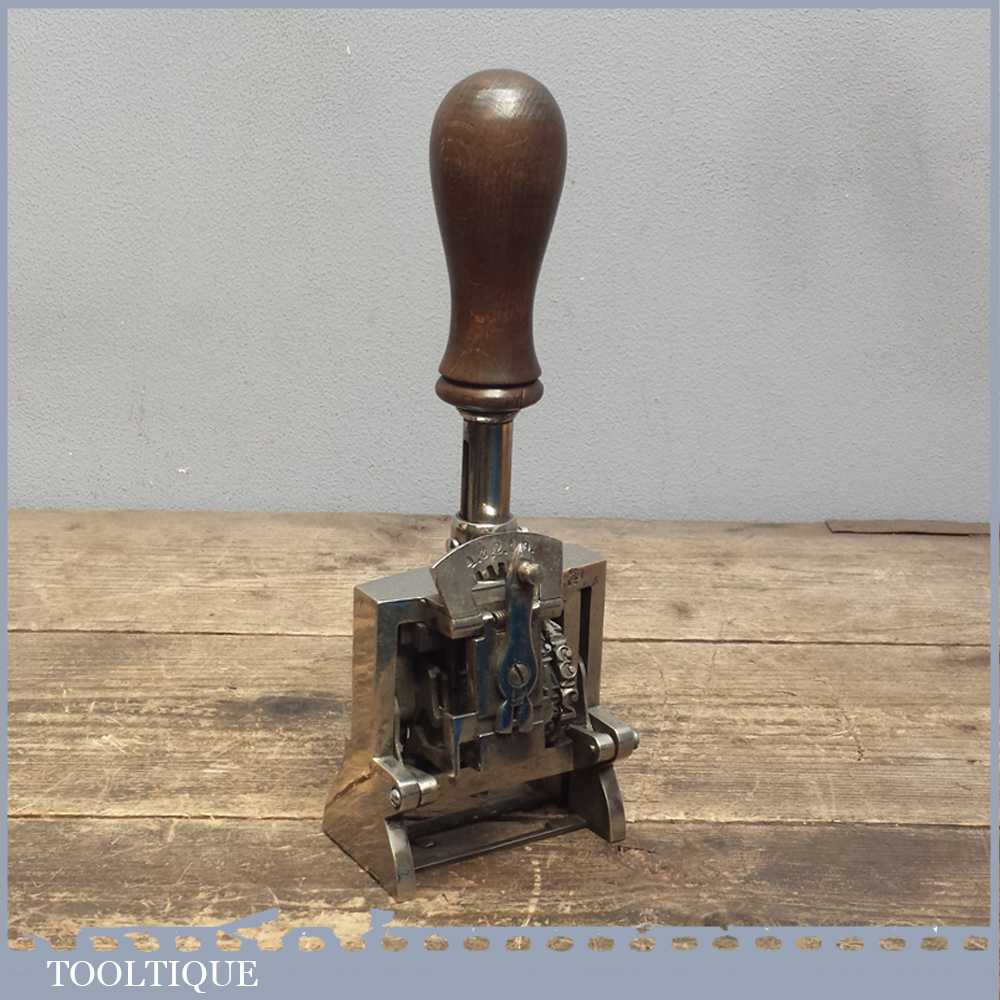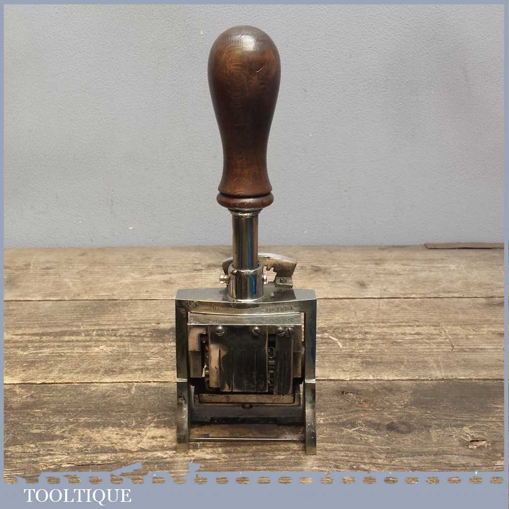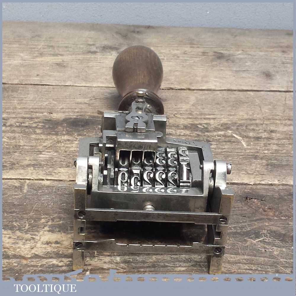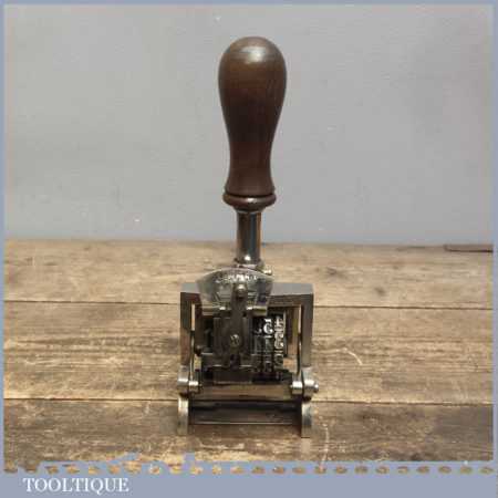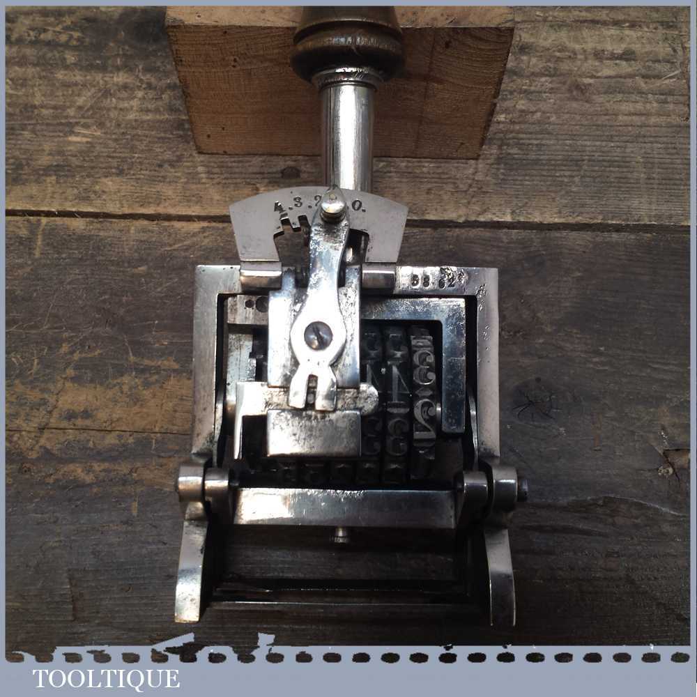 Vintage quality large No: 1851 automatic number stamp machine in good working order. This is tool is exceptionally large in size measuring over 3 ¼” wide and probably used for numbering boxed.