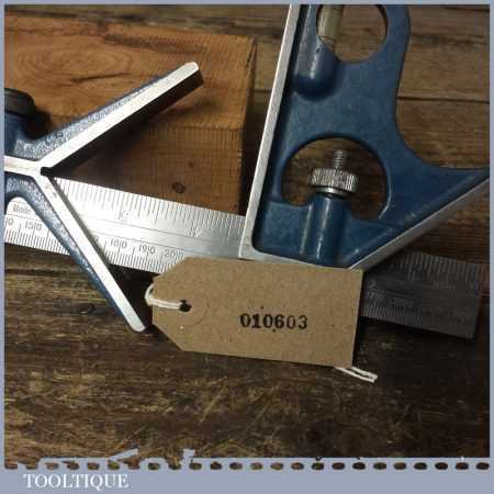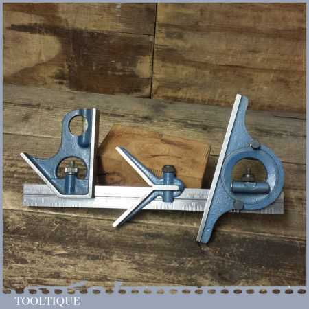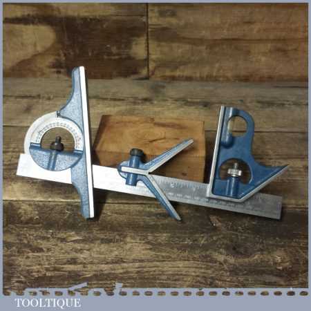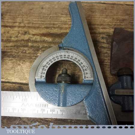 Vintage Rabone cast steel combination square, protractor and centre finder, complete and in good used condition. Note: The square part comes from another set and has a different adjuster screw, works fine though.