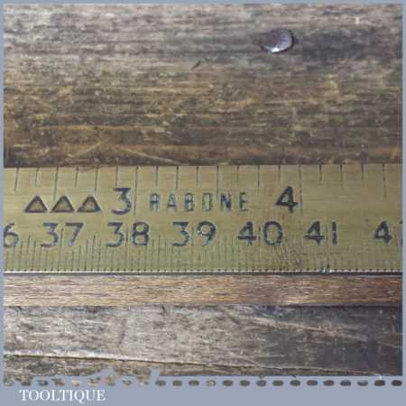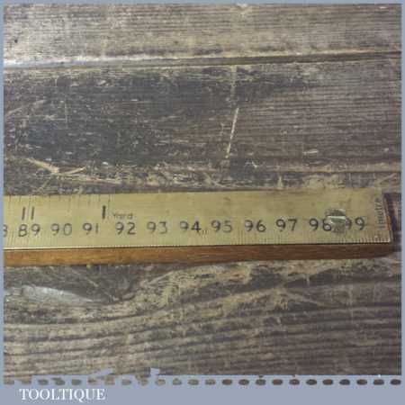 Vintage Rabone No: 1322 brass metric & imperial counter yardstick ruler mounted on a wooden base, in good used condition.