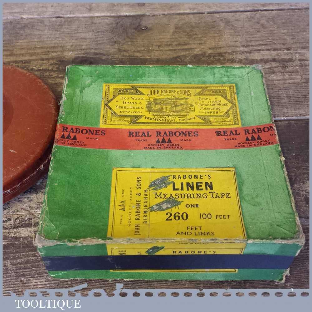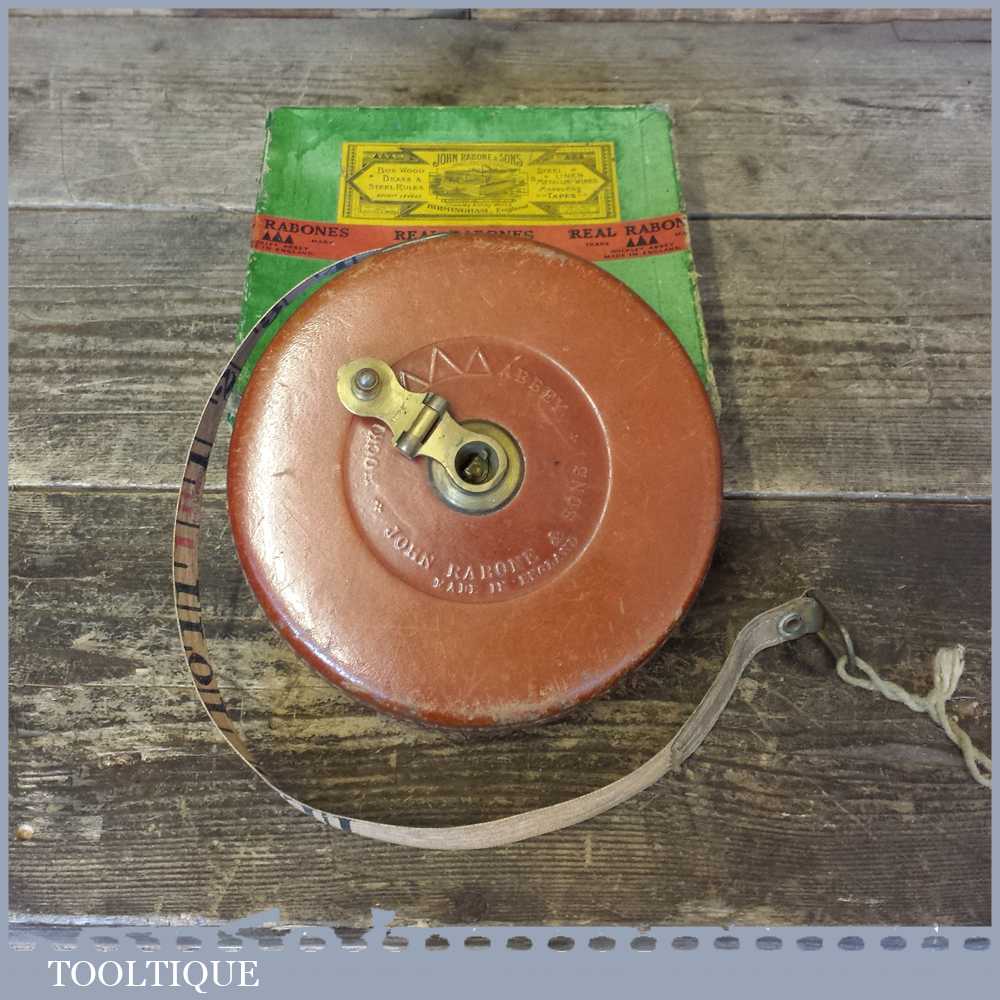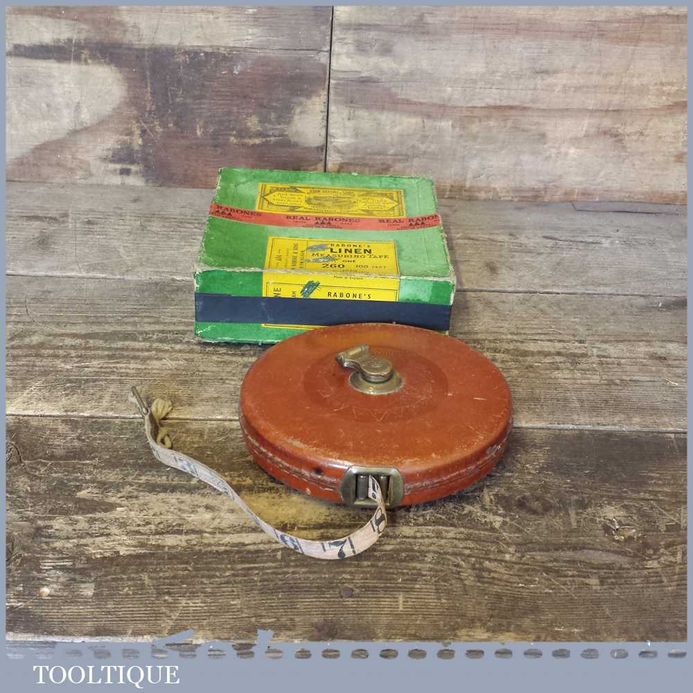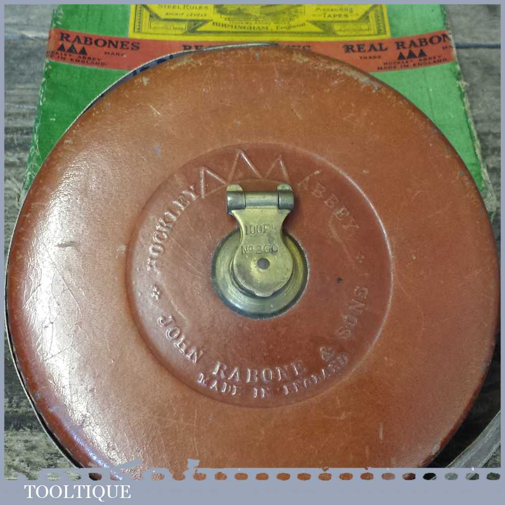 Vintage Rabone No: 260 leather bound 100ft measuring tape in its original box and in good used condition.