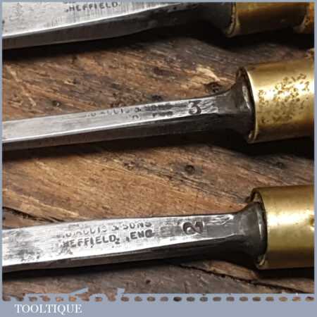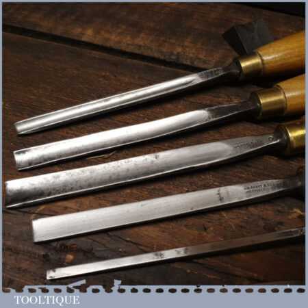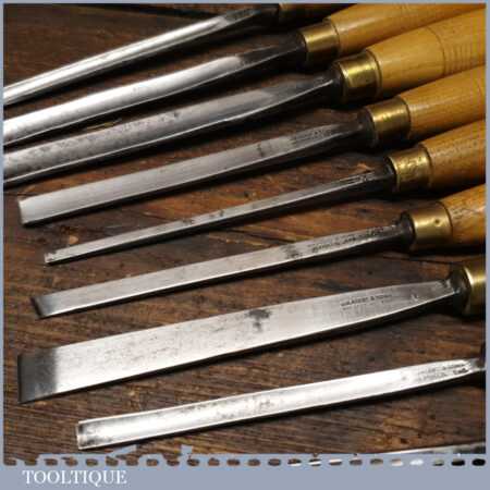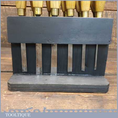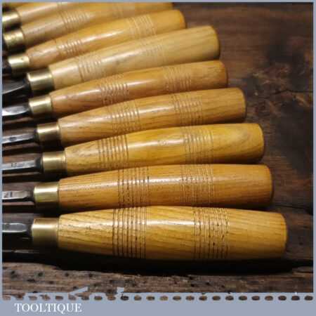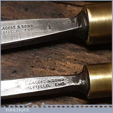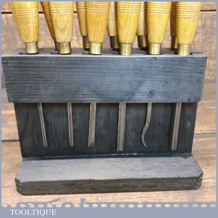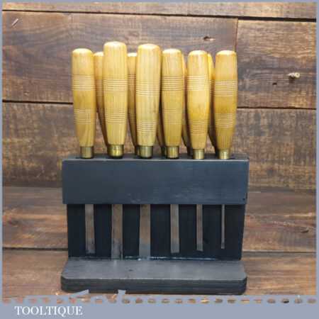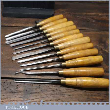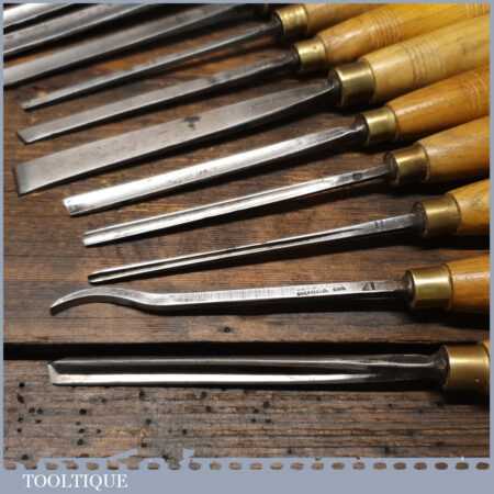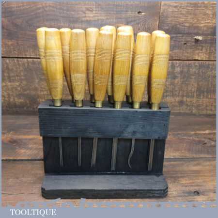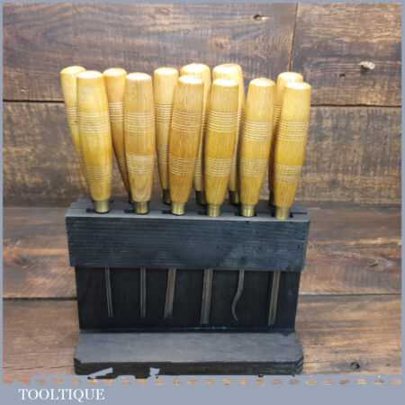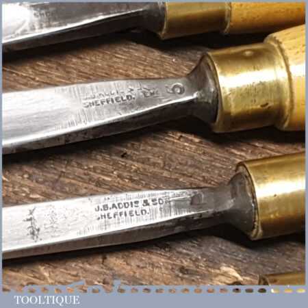 Vintage racked set of 12 No: matching J. B. Addis & Sons vintage wood carving chisels with ash handles in good used condition, fully refurbished sharpened and honed ready for use. These look to have their original handles (known design).