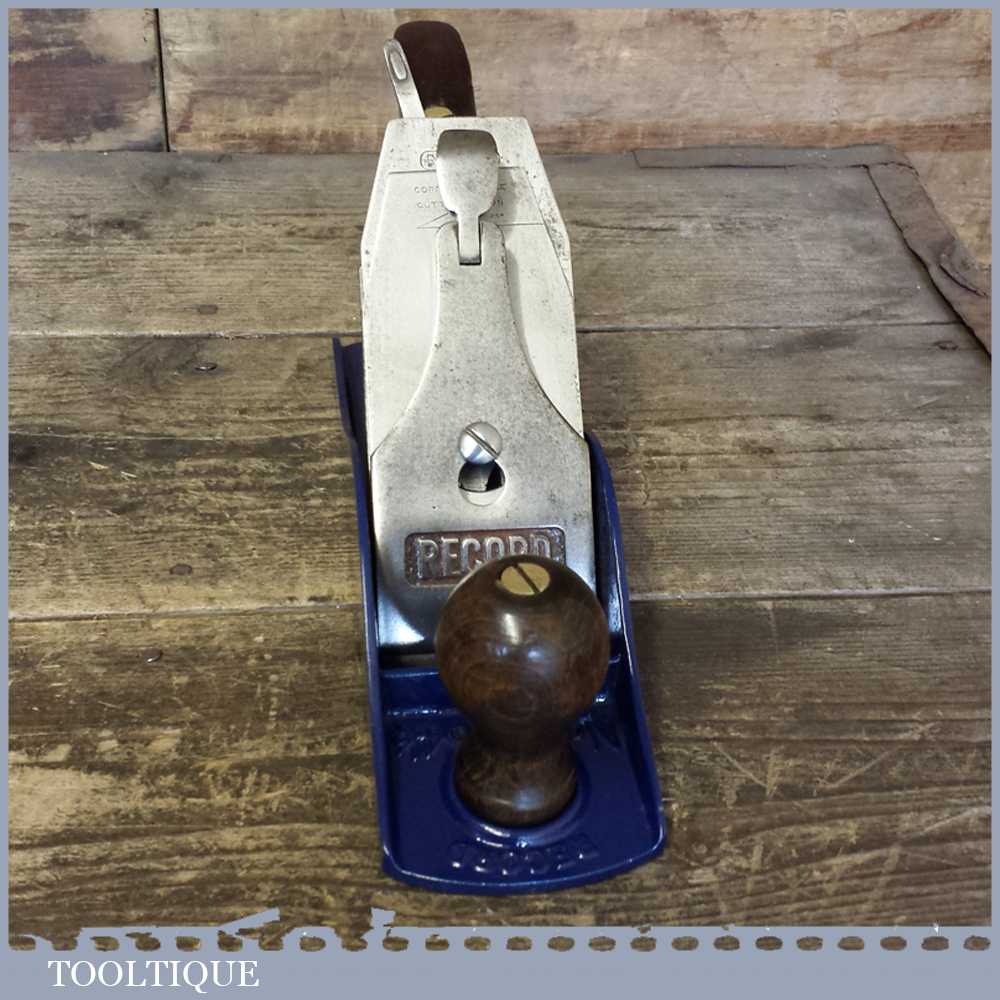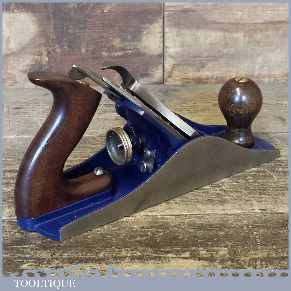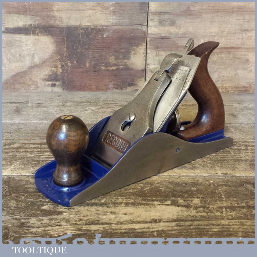 Vintage Record made in England No: 04 ½ wide bodied smoothing plane fully refurbished ready to use. Note: the sidewall has a partially drilled hole in the side which has is just cosmetic rather than affecting the planes performance.