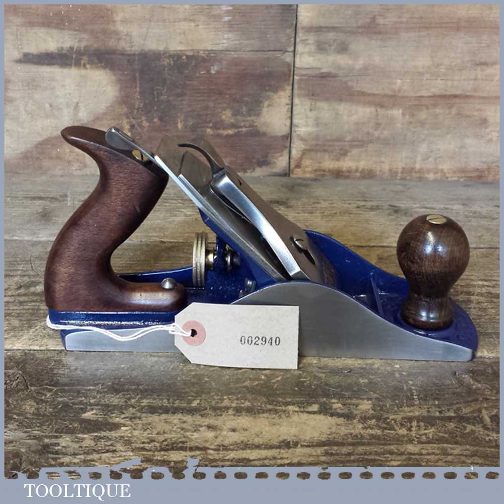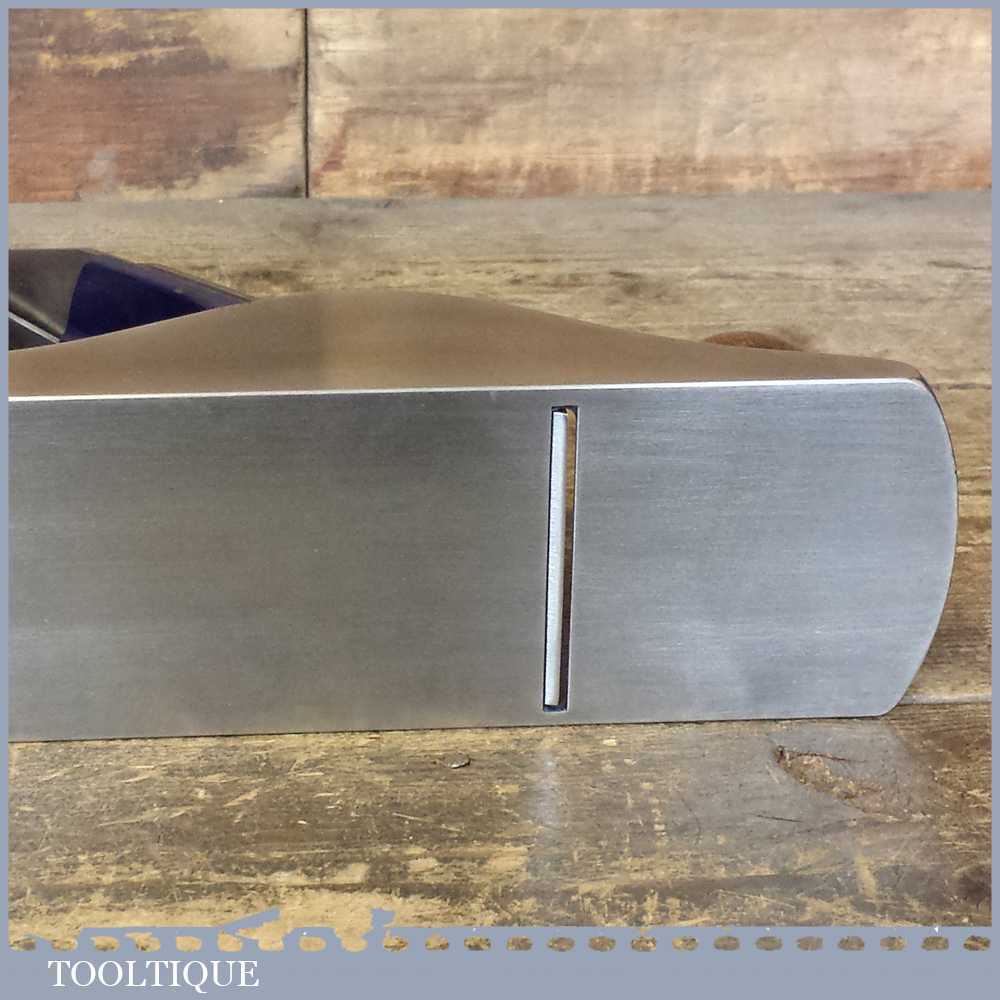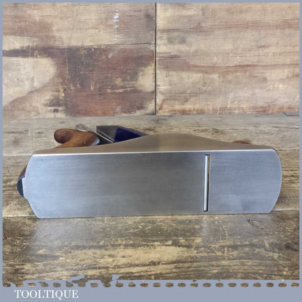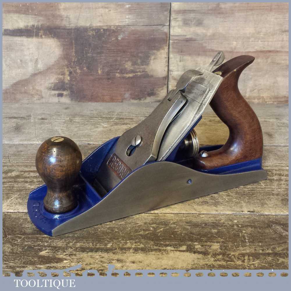 Vintage Record made in England No: 04 ½ wide bodied smoothing plane fully refurbished ready to use. Note: the sidewall has a partially drilled hole in the side which has is just cosmetic rather than affecting the planes performance.