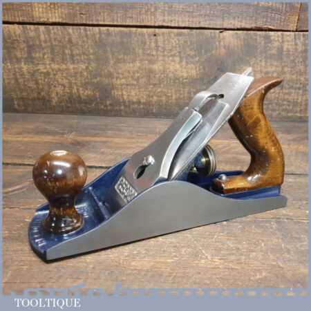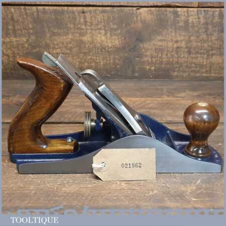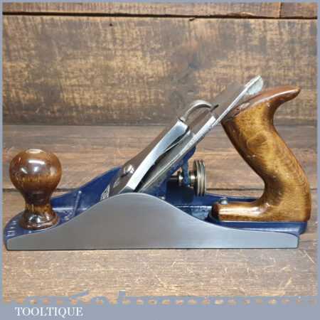 Vintage Record No: 04 ½ wide bodied smoothing plane, fully refurbished and in good used condition, ready to use. When refurbishing planes, we do not merely clean them to make them look good, they are restored to a level that ensures they are actually ‘in plane to 0.025mm’ sharpened, honed and all the components are thoroughly cleaned so that they move freely. Our planes are specifically reconditioned to satisfy professional tradesmen who will instantly know the difference between buying one of our planes over general other used ones.
