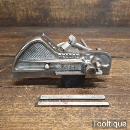 Vintage Record No: 043 plough plane complete with 3 cutters, fully refurbished and ready for use. The plane is in good condition and all components move smoothly. Note: We do not sharpen the irons.