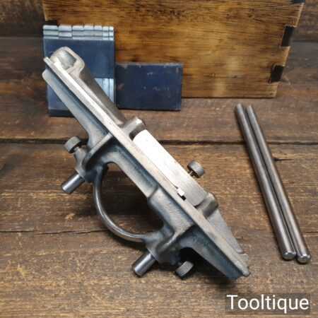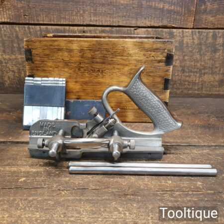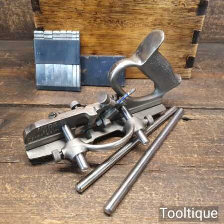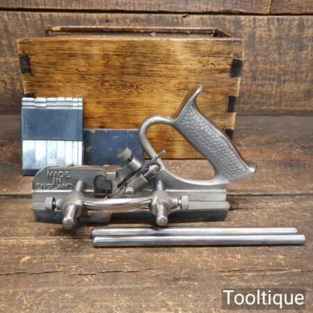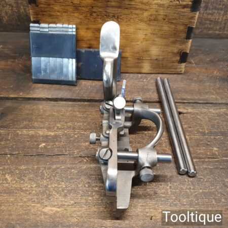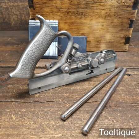 Vintage Record No: 044 plough plane complete with 8 cutters In wooden mahogany box, fully refurbished and ready for use. The plane is in good condition and all components move smoothly. Note: We do not sharpen the irons and box doesn’t come with lid.