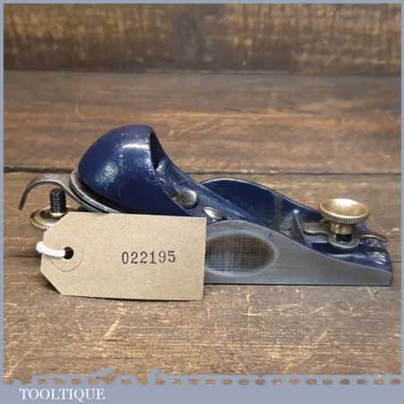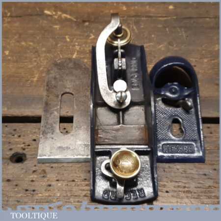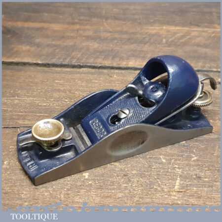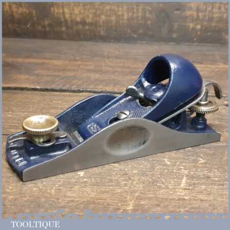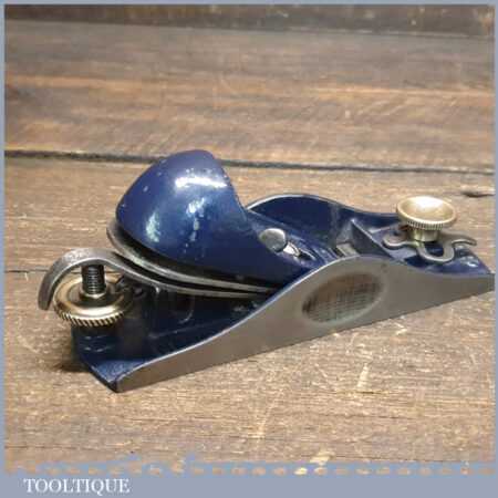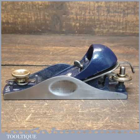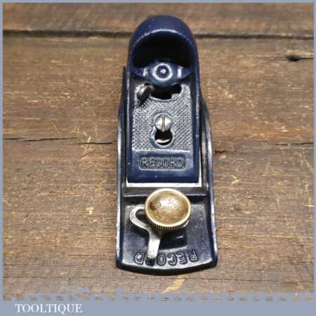 Vintage Record No: 09 ½ adjustable throat block plane, fully refurbished and in good used condition, ready to use. Note: The throat has been opened to disguise chip repair so doesn’t close up as tightly as it should, however everything else has been done to ensure it works as best it can, which is still better than many unrefined versions.