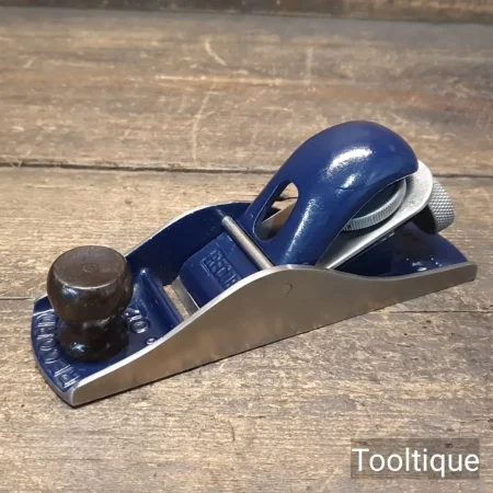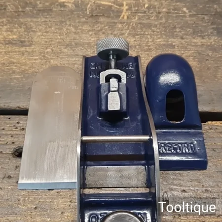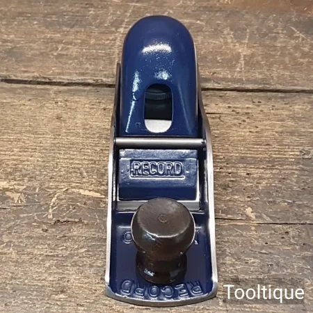 Vintage Record England No: 120 Block Plane with Screw Depth Adjustment, fully refurbished ready for use and in good used condition. When refurbishing planes, we do not merely clean them to make them look good, they are restored to a level that ensures this plane is actually ‘in plane to within 0.01mm’ sharpened, honed and all the components are thoroughly cleaned so that they move freely. Our planes are specifically reconditioned to satisfy professional tradesmen who will instantly know the difference between buying one of our planes over general other used ones.