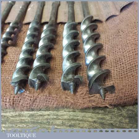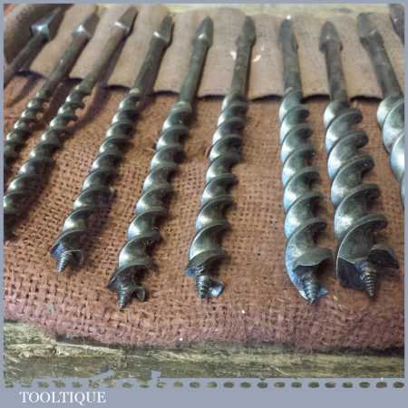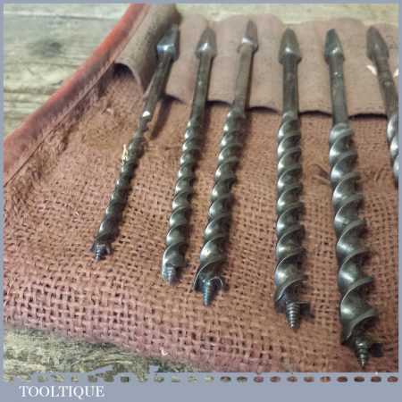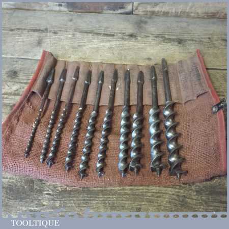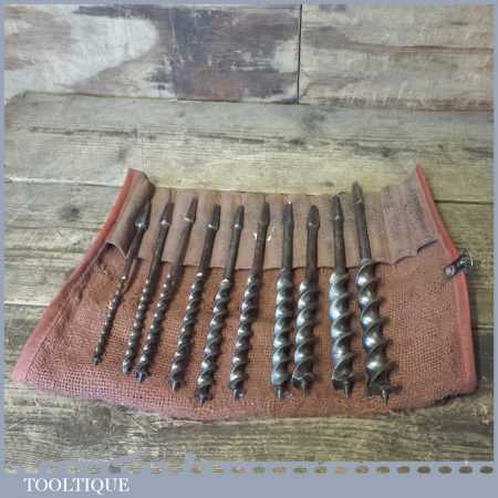 Vintage Ridgeway set of 10 No: double spur screw auger bits ranging between 1/4” – 1” in canvas roll, in good used condition.