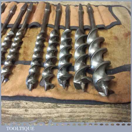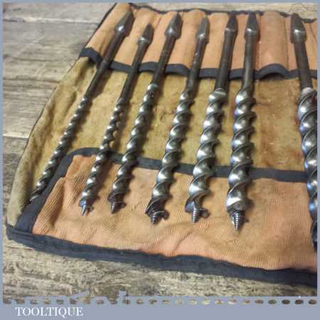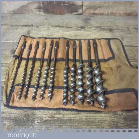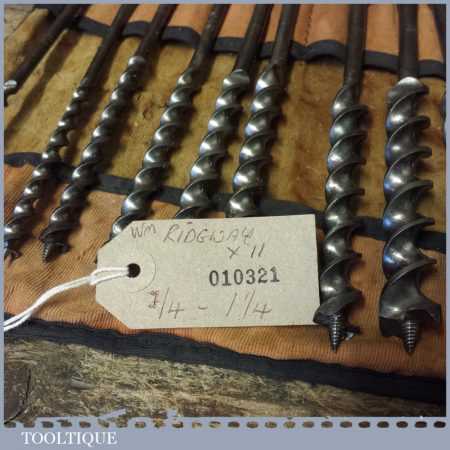 Vintage Ridgeway set of 11 No: double spur screw auger bits ranging between 1/4” – 1 ¼” in canvas roll, in good used condition.