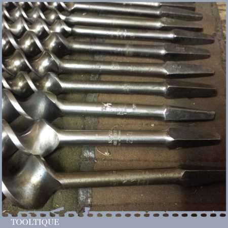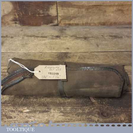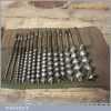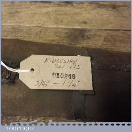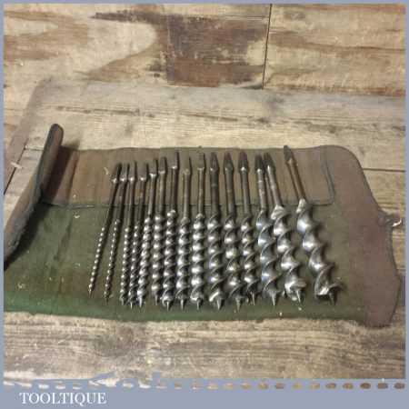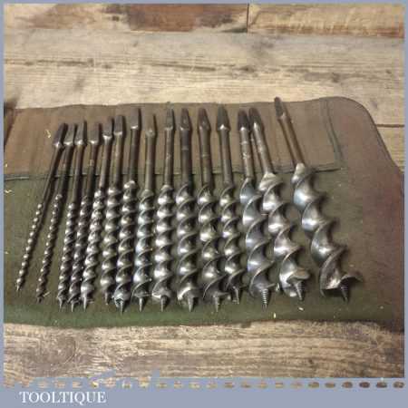 Vintage Ridgeway set of 15 No: double spur screw auger bits in a canvass roll, sizes range between 3/16” – 1 ¼”, in good used condition.
