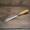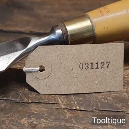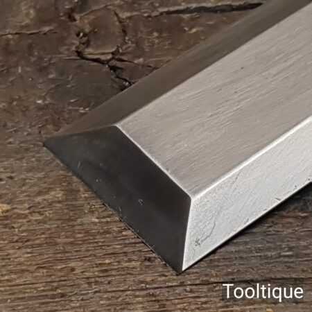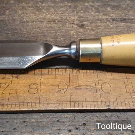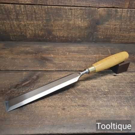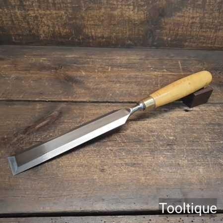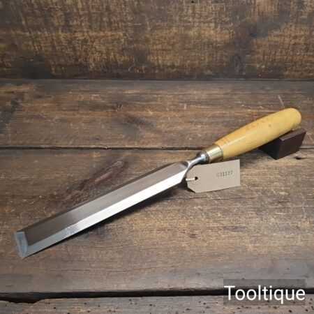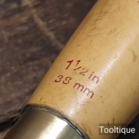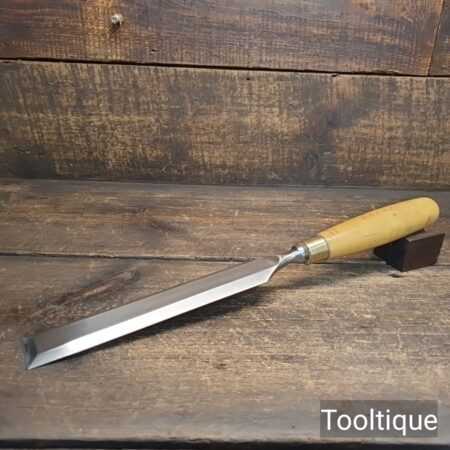 Vintage Robert Sorby 1 1/2″ long series bevelled edge chisel with a boxwood handle, fully refurbished ready for use and in good used condition. Note: The wide sizes at this length are hard to find, fine rehandling crack has been resin treated. All refurbished chisels are water cooled during the sharpening & flattening process to ensure the tempering is not affected.