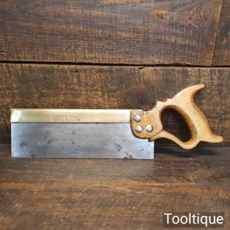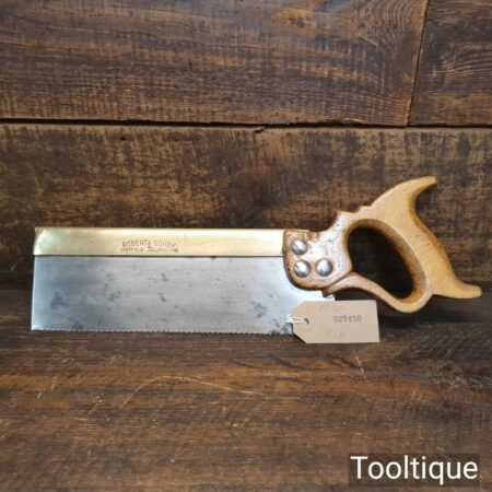 Vintage Robert Sorby 10” brass back tenon saw with 11 tpi, fully refurbished and sharpened Rip ready for use. Note: Extra stud added at some point to tighten handle causing a minor crack to the area of the stud, resin treated and no longer relies on this fixing to stay firm.