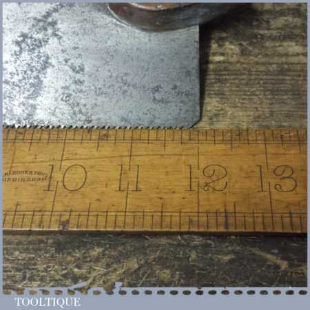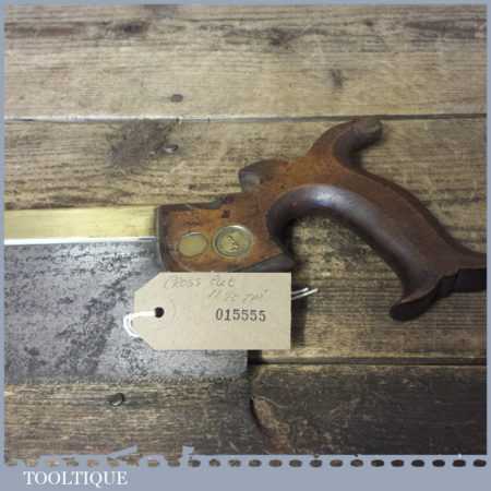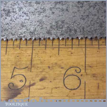 The saw has been thoroughly cleaned including under the handle, jointed, resharpened and set by hand so that all the hard work of getting an old vintage saw right has been undertaken. We do this so that the next sharpening is easier and no more than a quick freshen up would be required. Those who are familiar with sharpening will know this is no small job and requires skill, effort and time to achieve good results