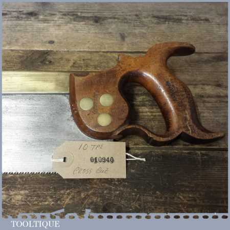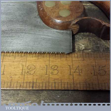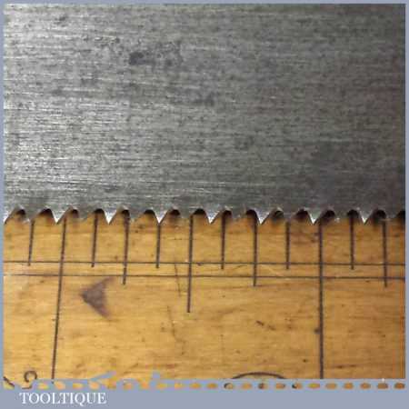 The saw has been thoroughly cleaned, jointed, resharpened and set by hand so that all the hard work of getting an old vintage saw right has been undertaken. We do this so that the next sharpening is easier and no more than a quick freshen up would be required. Those who are familiar with sharpening will know this is no small job and requires skill, effort and time to achieve good results.