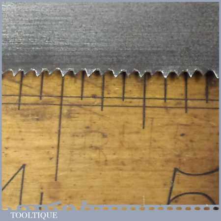 The saw has been thoroughly cleaned, jointed, resharpened and set by hand so that all the hard work of getting an old vintage saw right has been undertaken. We do this so that the next sharpening is easier and no more than a quick freshen up would be required. Those who are familiar with sharpening will know this is no small job and requires skill, effort and time to achieve good results.