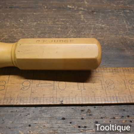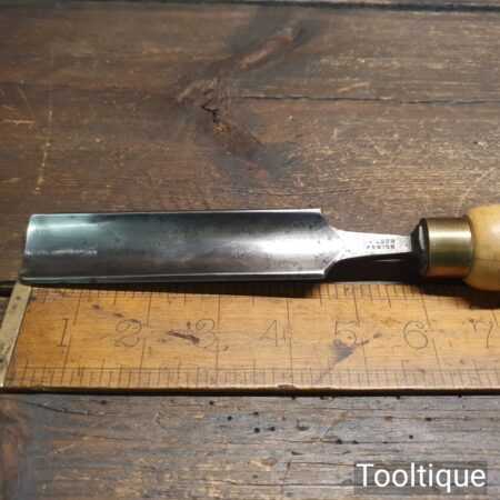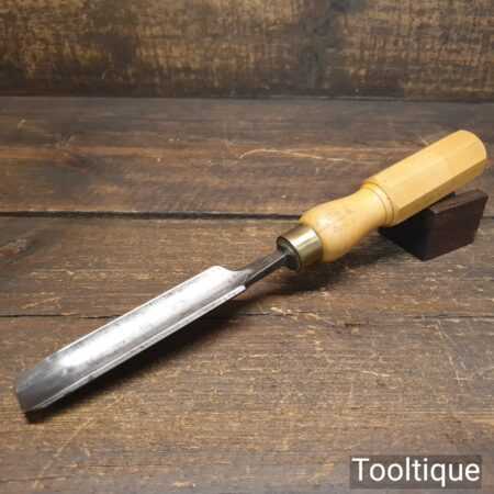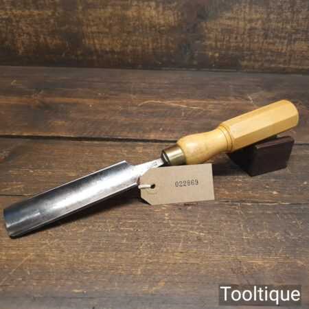 Vintage S. Wilson of Ipswich carpenter’s 1” gouge chisel with London pattern boxwood handle in good used condition, fully refurbished sharpened and honed ready for use. Note: Old handling crack resin treated and is strong.