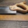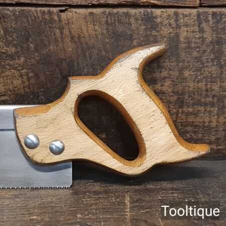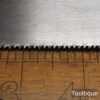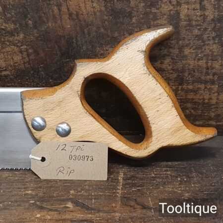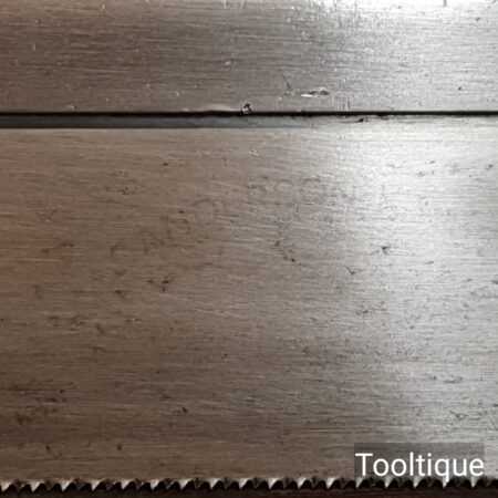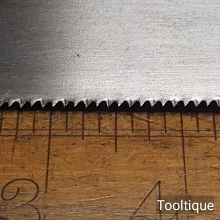 The saw has been thoroughly cleaned, jointed, resharpened and set by hand so that all the hard work of getting an old vintage saw right has been undertaken. We do this so that the next sharpening is easier and no more than a quick freshen up would be required. Those who are familiar with sharpening will know this is no small job and requires skill, effort and time to achieve good results.