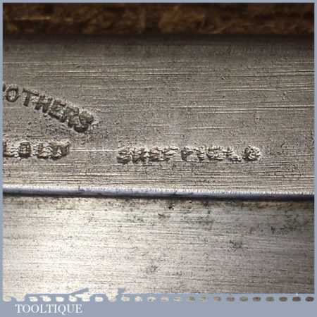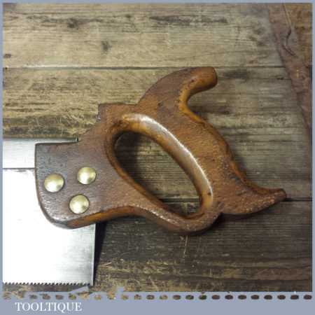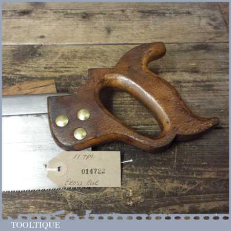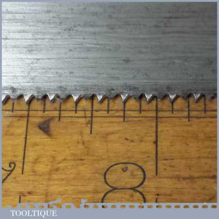 The saw has been thoroughly cleaned including under the handle, jointed, resharpened and set by hand so that all the hard work of getting an old vintage saw right has been undertaken. We do this so that the next sharpening is easier and no more than a quick freshen up would be required. Those who are familiar with sharpening will know this is no small job and requires skill, effort and time to achieve good results.