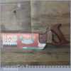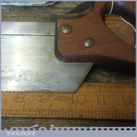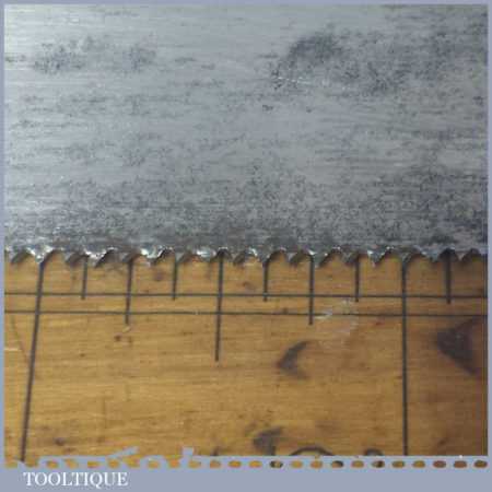 The saw has been thoroughly cleaned, jointed, resharpened and set by hand so that all the hard work of getting an old vintage saw right has been undertaken. We do this so that the next sharpening is easier and no more than a quick freshen up would be required. Those who are familiar with sharpening will know this is no small job and requires skill, effort and time to achieve good results.