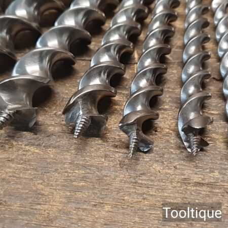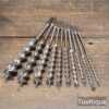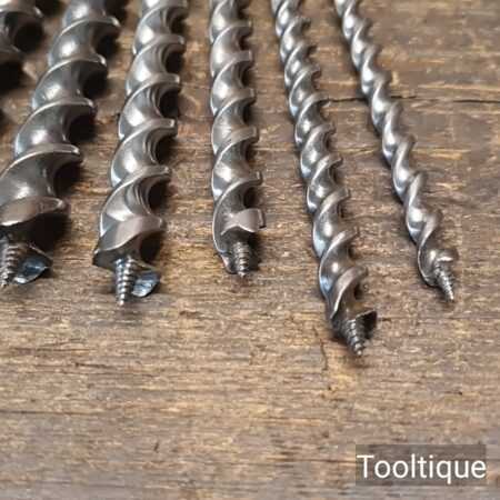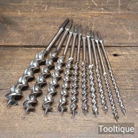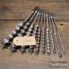 Vintage selection of 10 No: carpenters Jenning’s pattern twist bits for a brace, sharpened ready for use and in good used condition. Note: Various makers, all different sizes.