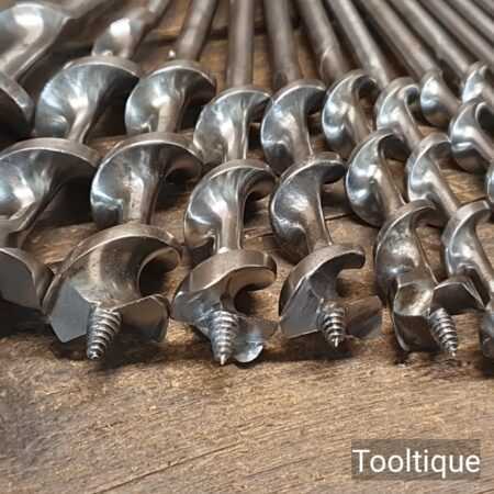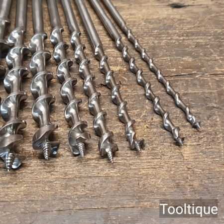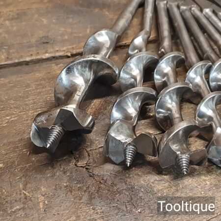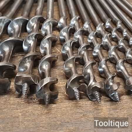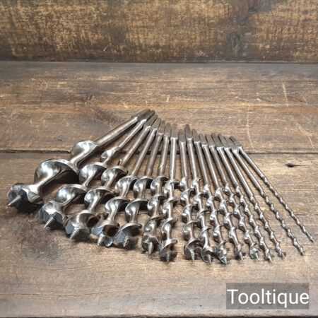 Vintage selection of 16 No: Old Irwin Pattern woodworking brace bits, sharpened ready for use and in good used condition. Sizes from 3/16ths to 1 ½”, various old makers.