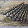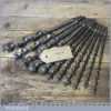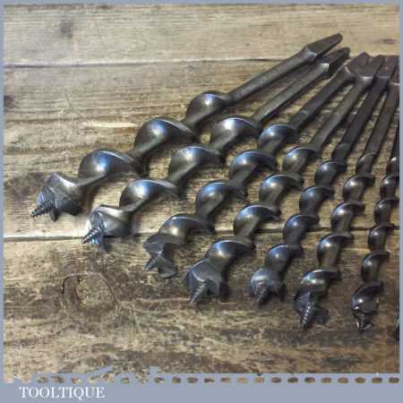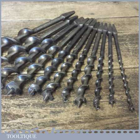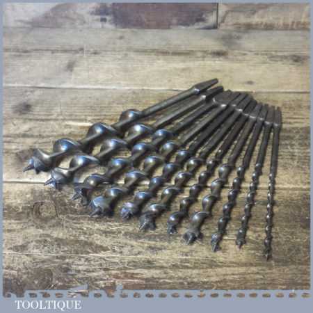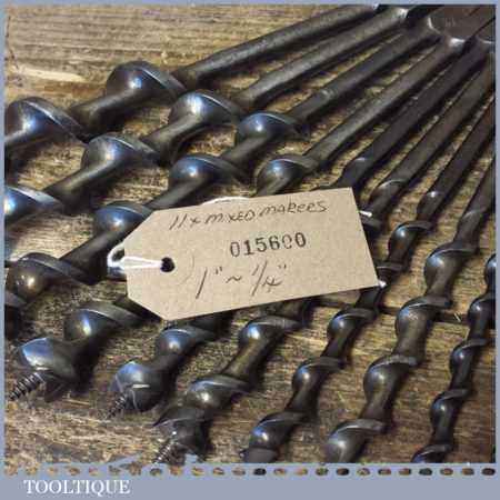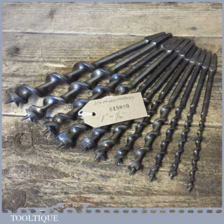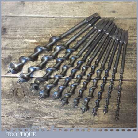 Vintage set of 11 No: double spur screw auger bits by various makers ranging between 1/4” – 1”, in good used condition. These have been sharpened ready for use.