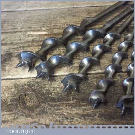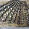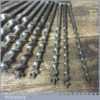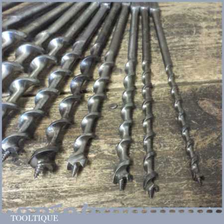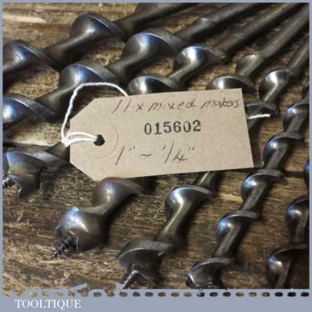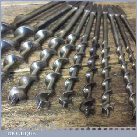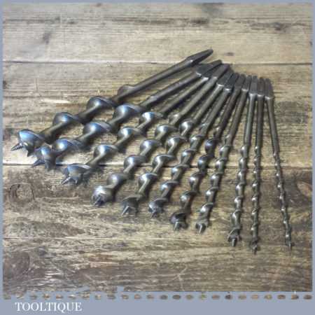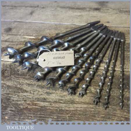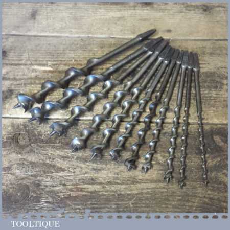 Vintage set of 11 No: double spur screw auger bits by various makers ranging between 1/4” – 1”, in good used condition. These will require sharpening to improve their performance.