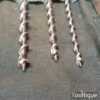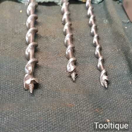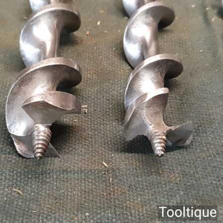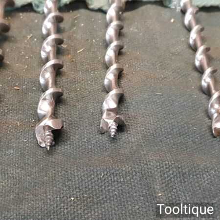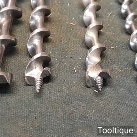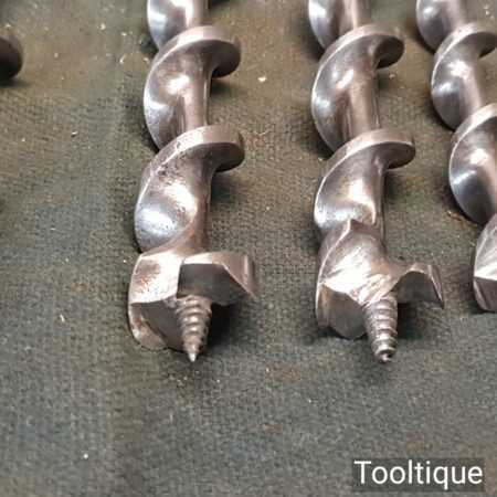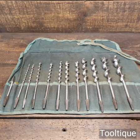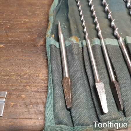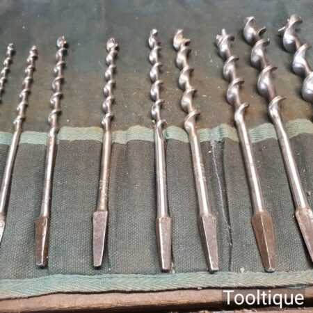 Vintage Set of 11 spur auger bits (1 ¼” – ¼”). These come with a roll and have been sharpened, in good used condition. Note: Some bits are sharpened slightly differently by the previous owner but it is still a good working set, priced accordingly.