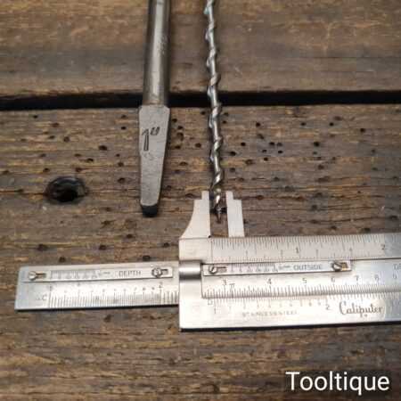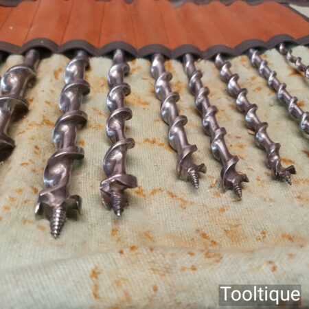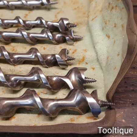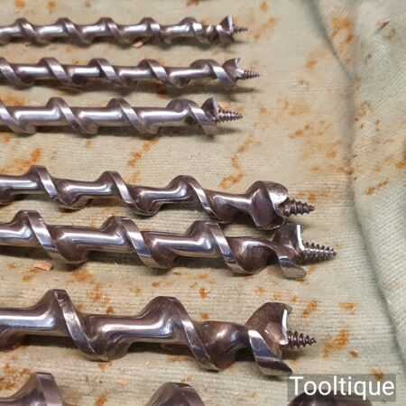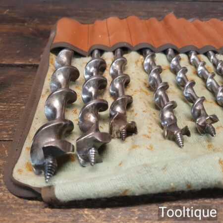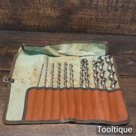 Vintage set of 11 various auger bits in roll, sizes ranging from ⁷⁄₃₂” – 1” sharpened and cleaned ready for use and in good used condition. Note: Various old makers.