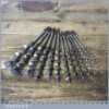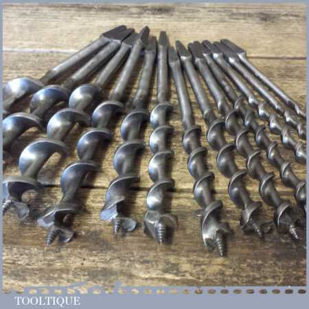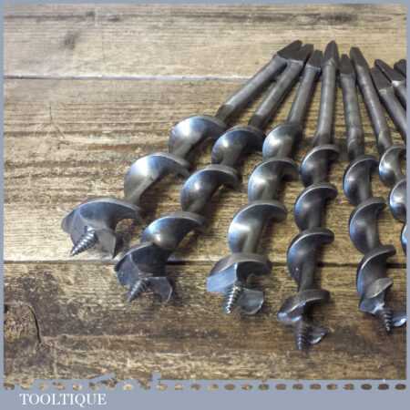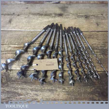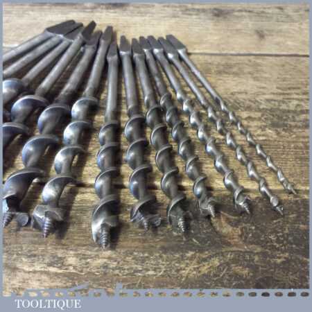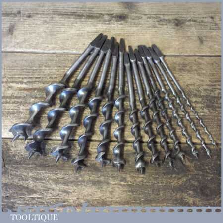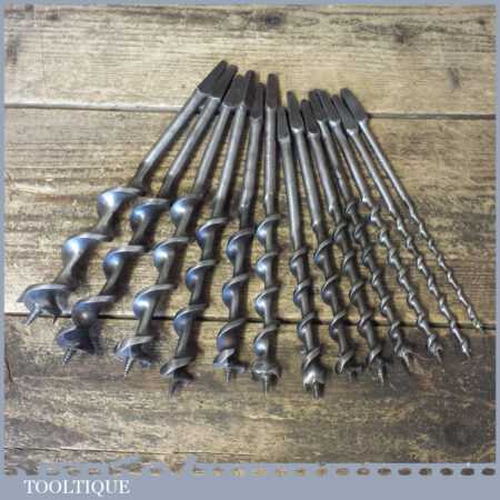 Vintage set of 13 No: double spur screw auger bits by various makers ranging between 1/4” – 1” sharpened ready for use and in good used condition.