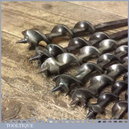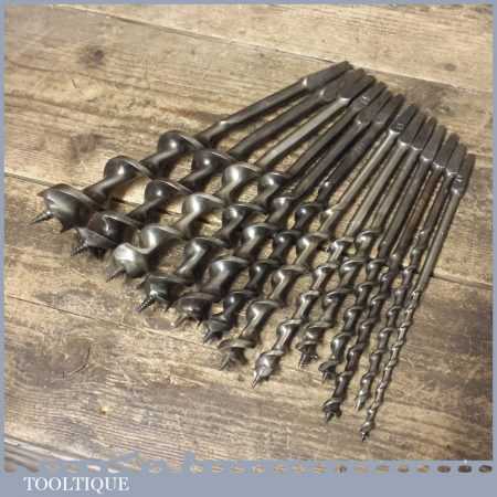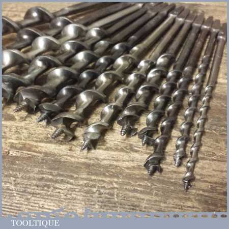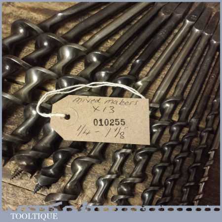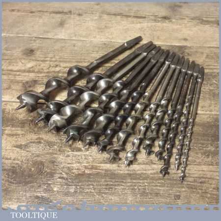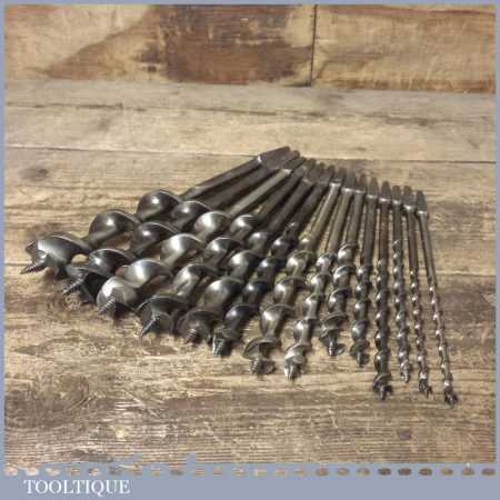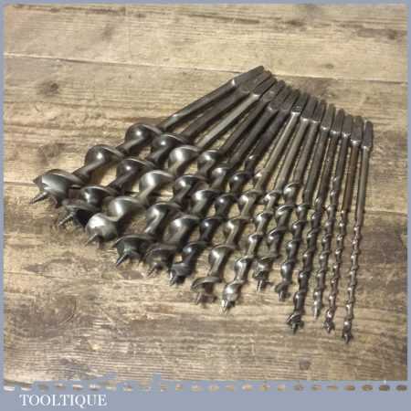 Vintage set of 13 No: double spur screw auger bits by various makers ranging between 1/4” – 1 1/8”, in good used condition.