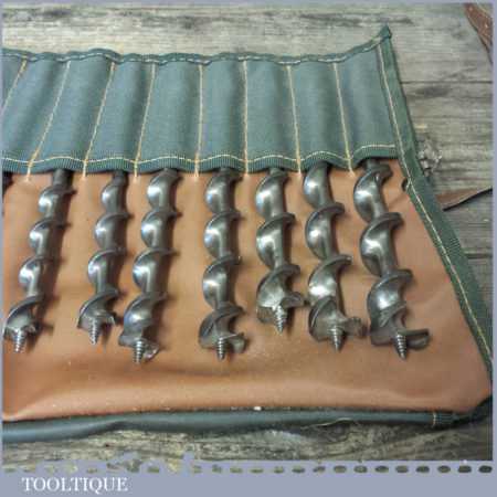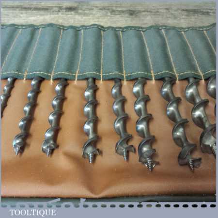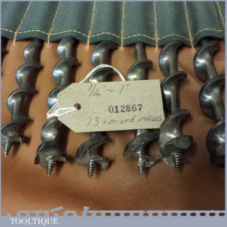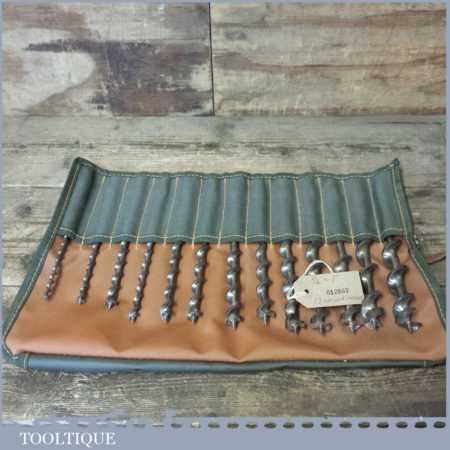 Vintage set of 13 No: double spur screw auger bits by various makers ranging between 1/4” – 1” in a roll, in good used condition.