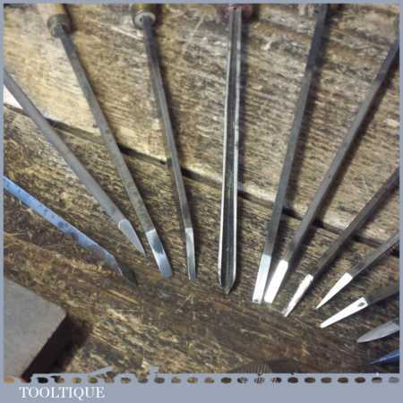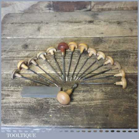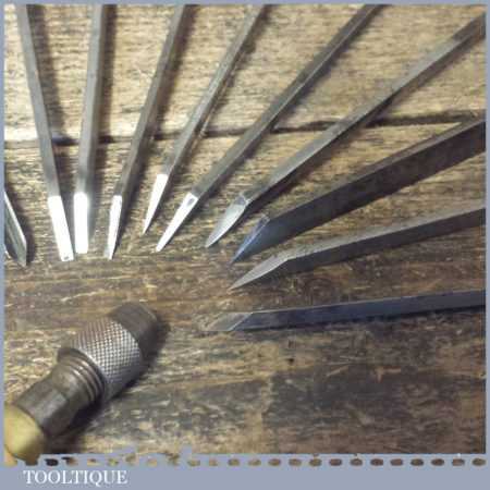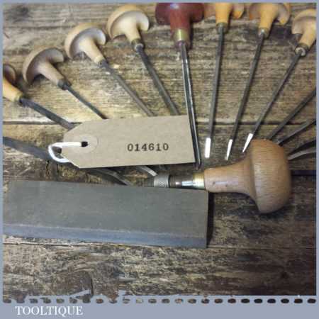 Vintage set of 14 No: various sized engraving palm chisels plus one multitool holder handle, 1 No: slip stone, in good used condition.