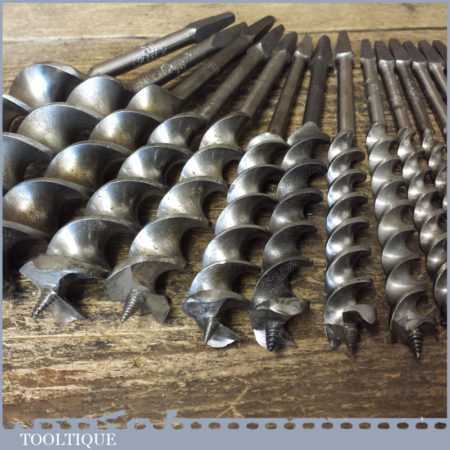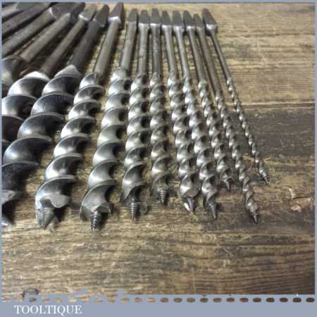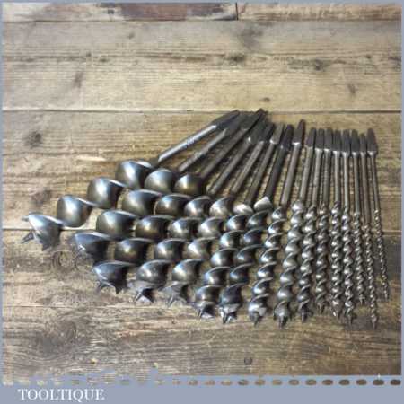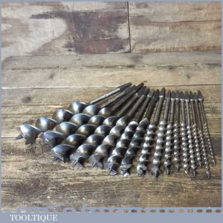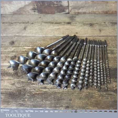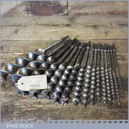 Vintage set of 16 No: double spur screw auger bits by various makers ranging between 1/4” – 1-7⁄16”, in good used condition sharpened