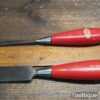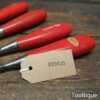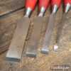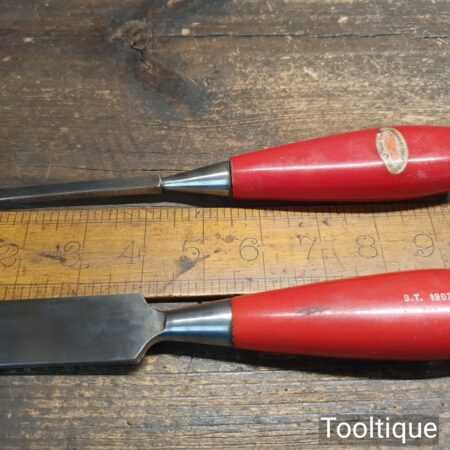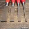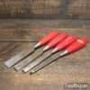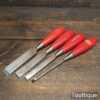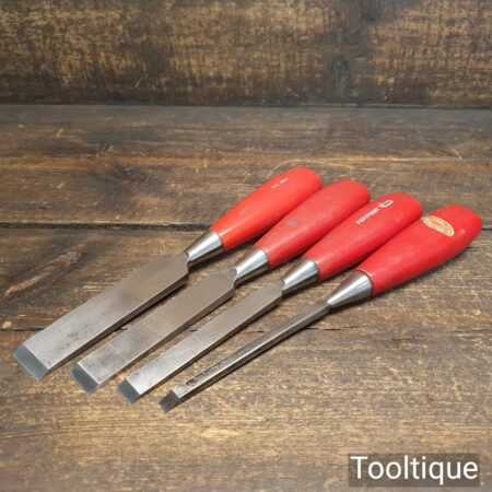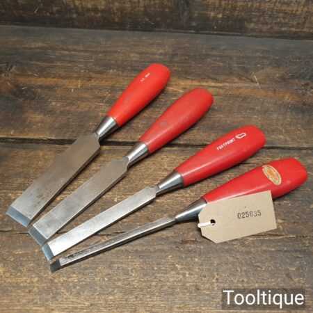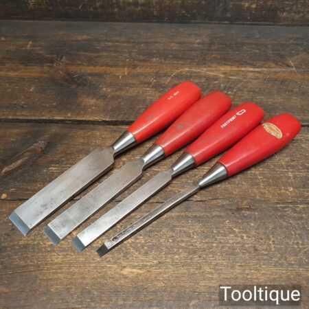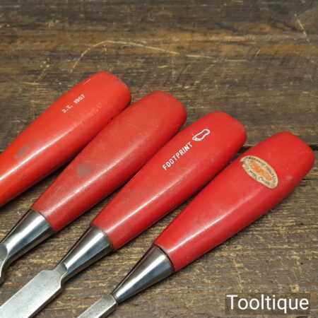Vintage set of 4 Footprint Firmer chisels (1″, 3/4″, 1/2″, 1/4″) with Plastic handles in good used condition, fully refurbished sharpened and honed ready for use.
