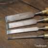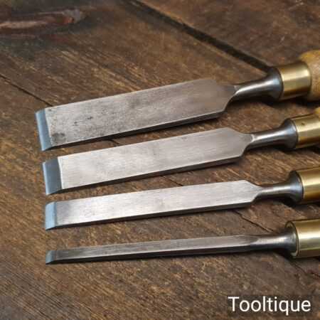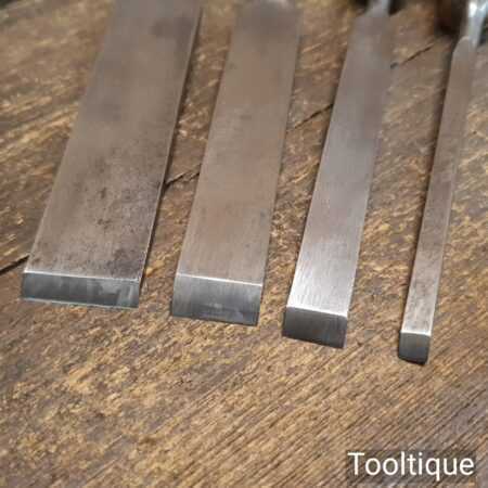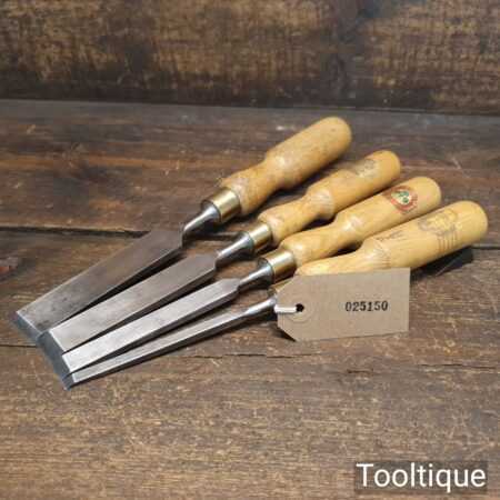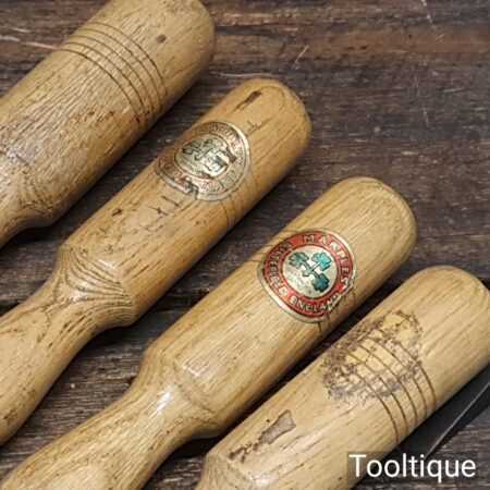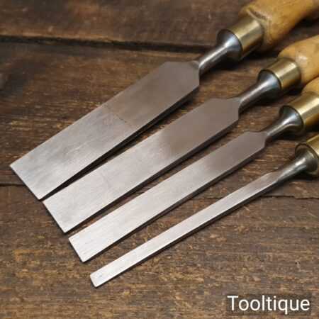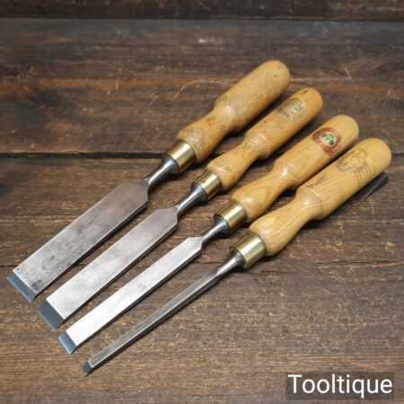 Vintage Set of 4 Marples firmer chisels (1”, ¾”, ½”, ⅛”) with beechwood handles in good used condition, fully refurbished sharpened, and honed ready for use.