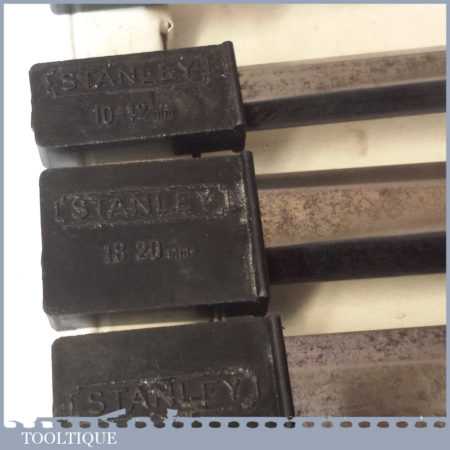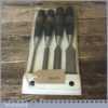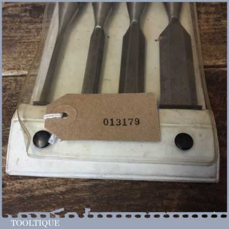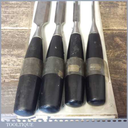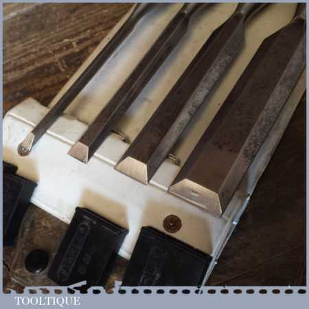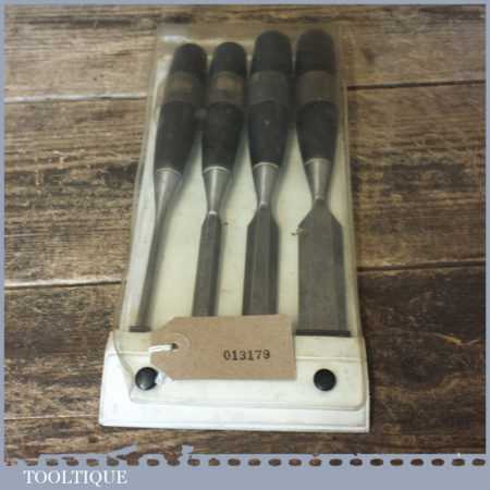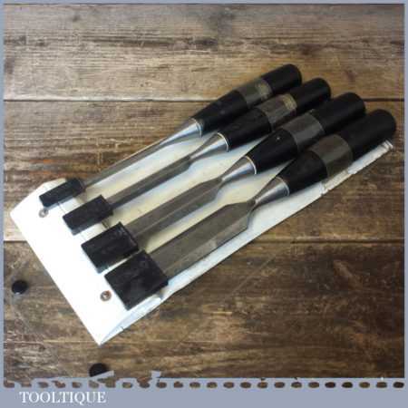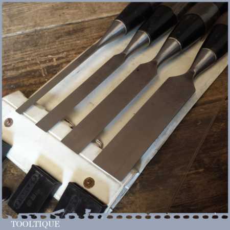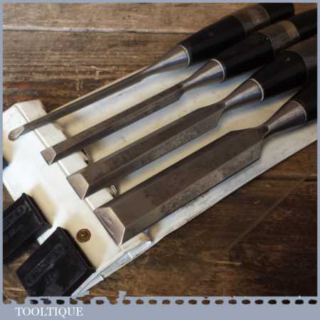 Vintage set 4 No: Stanley No: 5001 carpenter’s bevel edged chisels with plastic handles in good used condition, the set comprises of 1″, 3/4″,1/2″, 1/4″ fully refurbished sharpened and honed ready for use.