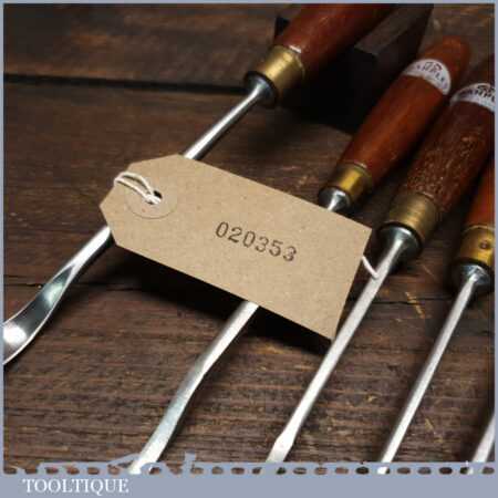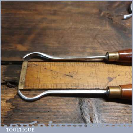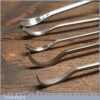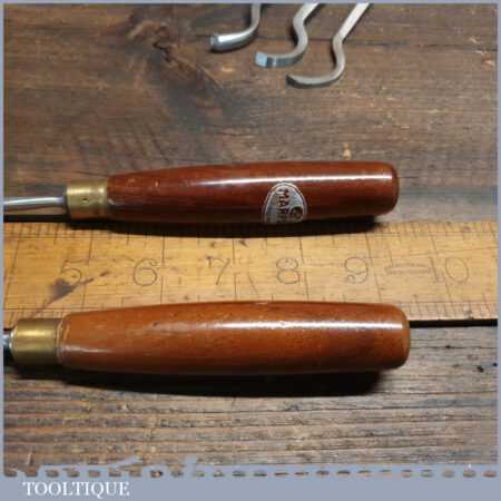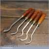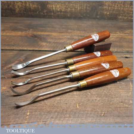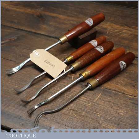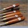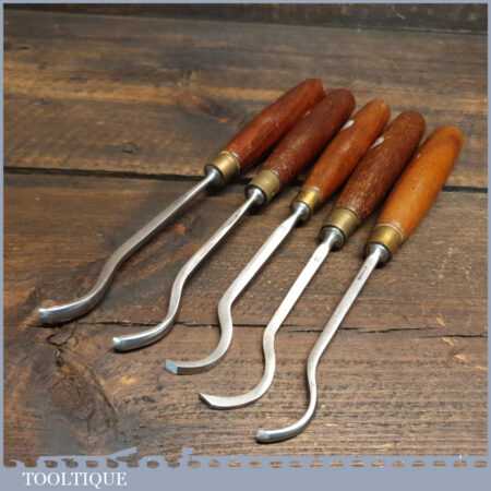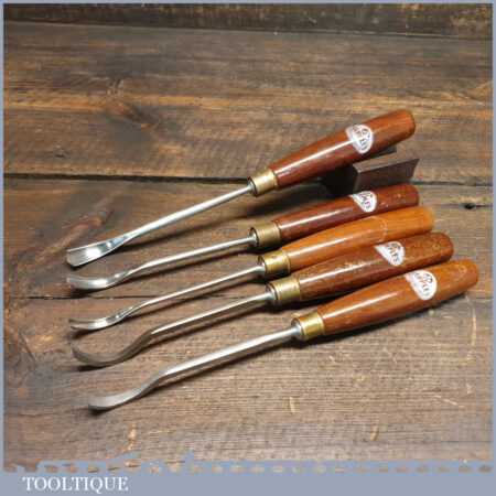 Vintage set of 5 No: Marples assorted spoon wood carving chisels with mahogany handles in good used condition, fully refurbished sharpened and honed ready for use. Note: These were not from standard sets and had to be bought individually from the professional range.