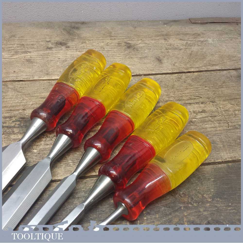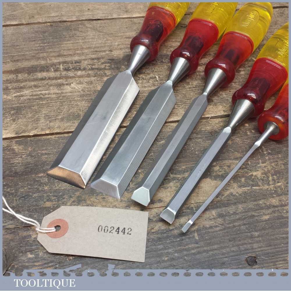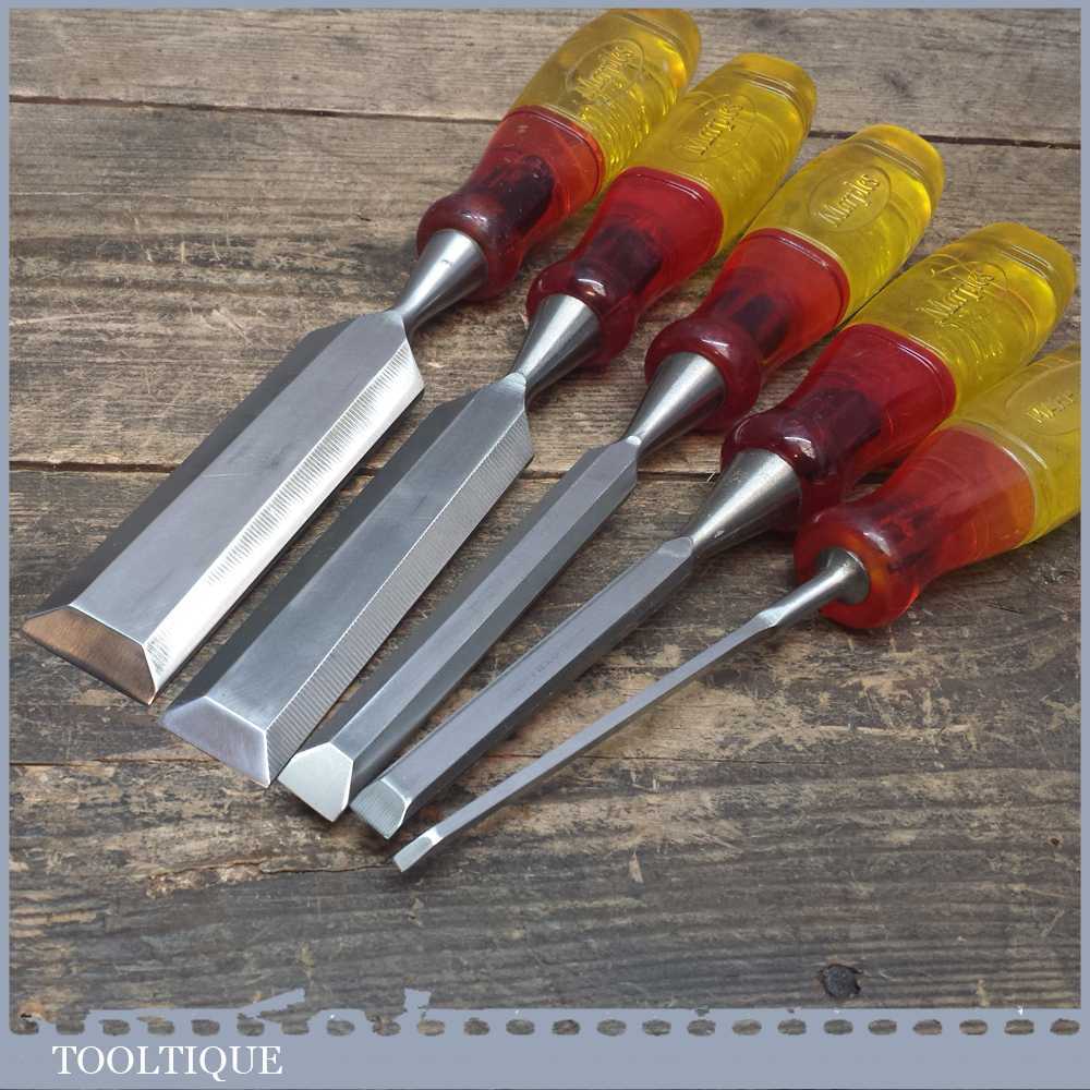 Vintage set Of 5 Marples Bevel Edge Carving Chisels with Shatterproof Handles. Sizes ranging from ¼ to 1 ¼” all chisels are in a good used condition sharpened and honed ready to use. These are a decent jobbing chisel suitable for general site work and are usually a general carpenter’s choice. However those who are in need of higher quality steel it’s always better to buy older chisels as they are constructed to a higher standard.