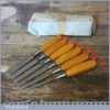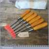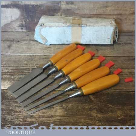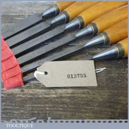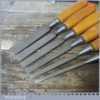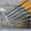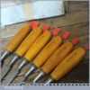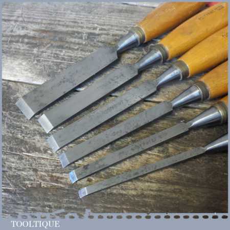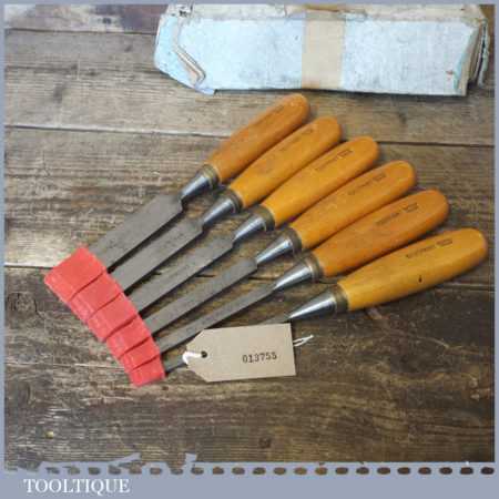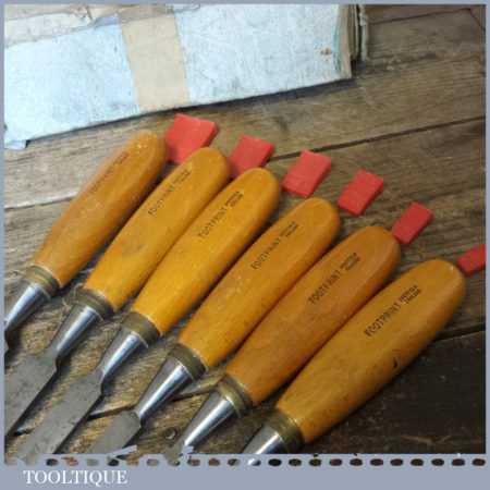 Vintage set of 6 No: Footprint socketed firmer chisels (1/4”, 3/8”, 1/ 2”, 5/8”, 3/4” & 1”) with beechwood handles, in good used condition and ready for use.