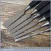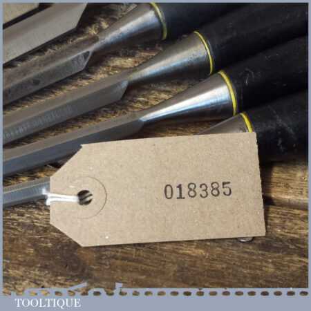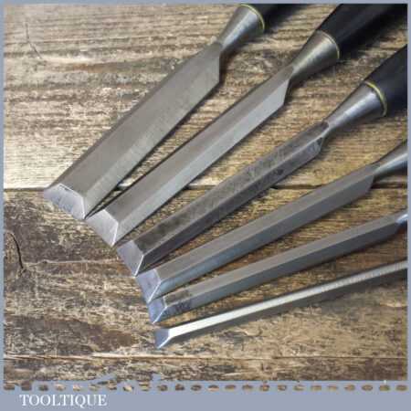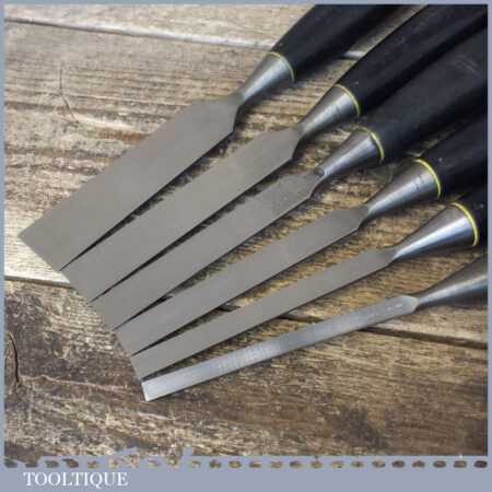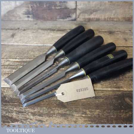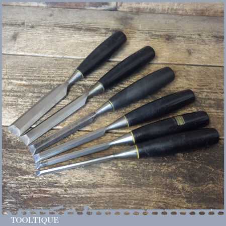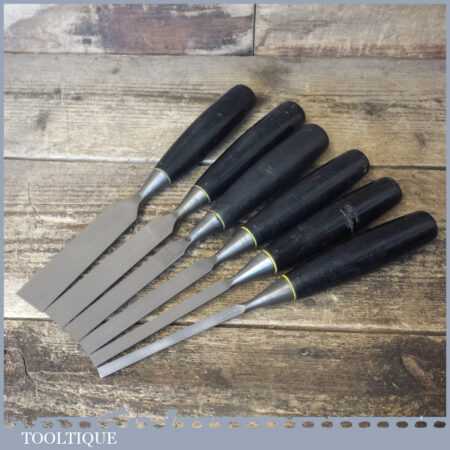 Vintage set of 6 No: Stanley 5001 socketed bevel edge chisels (1/4”, 3/8”, 1/ 2”, 5/8”, 3/4” & 1”) with beechwood handles, in good used condition and ready for use. This is the earlier type with yellow band.