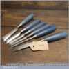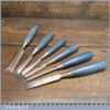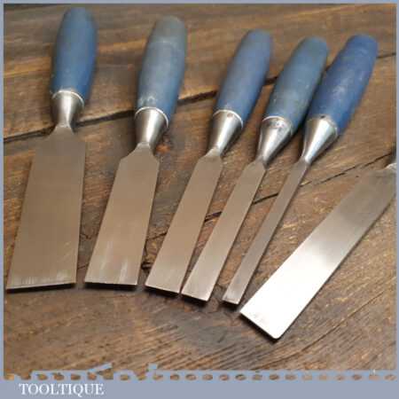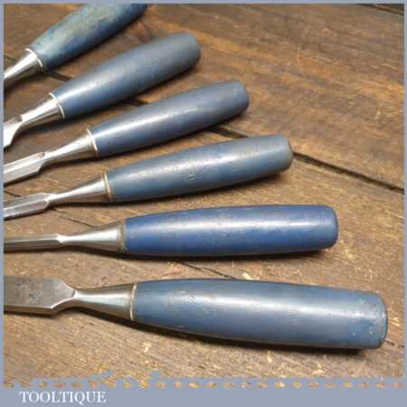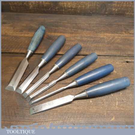 Vintage set of 6 No: Stanley No: 5002 chisels (1/4”, 3/8”, 1/2”, 3/4” & 1”) bevel edged and 1 No: 5/8” firmer chisel with plastic handles in good used condition, fully refurbished sharpened and honed ready for use.