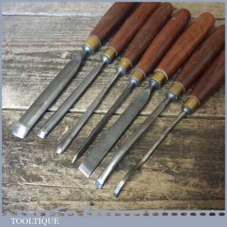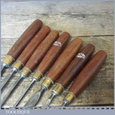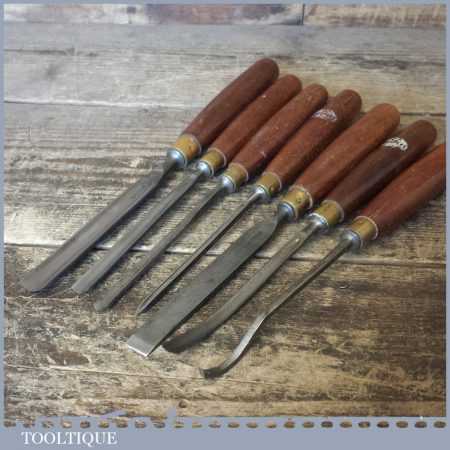 Vintage Set of 7 No: Marples wood carving chisels with mahogany handles in good used condition and sharpened and honed ready for use.